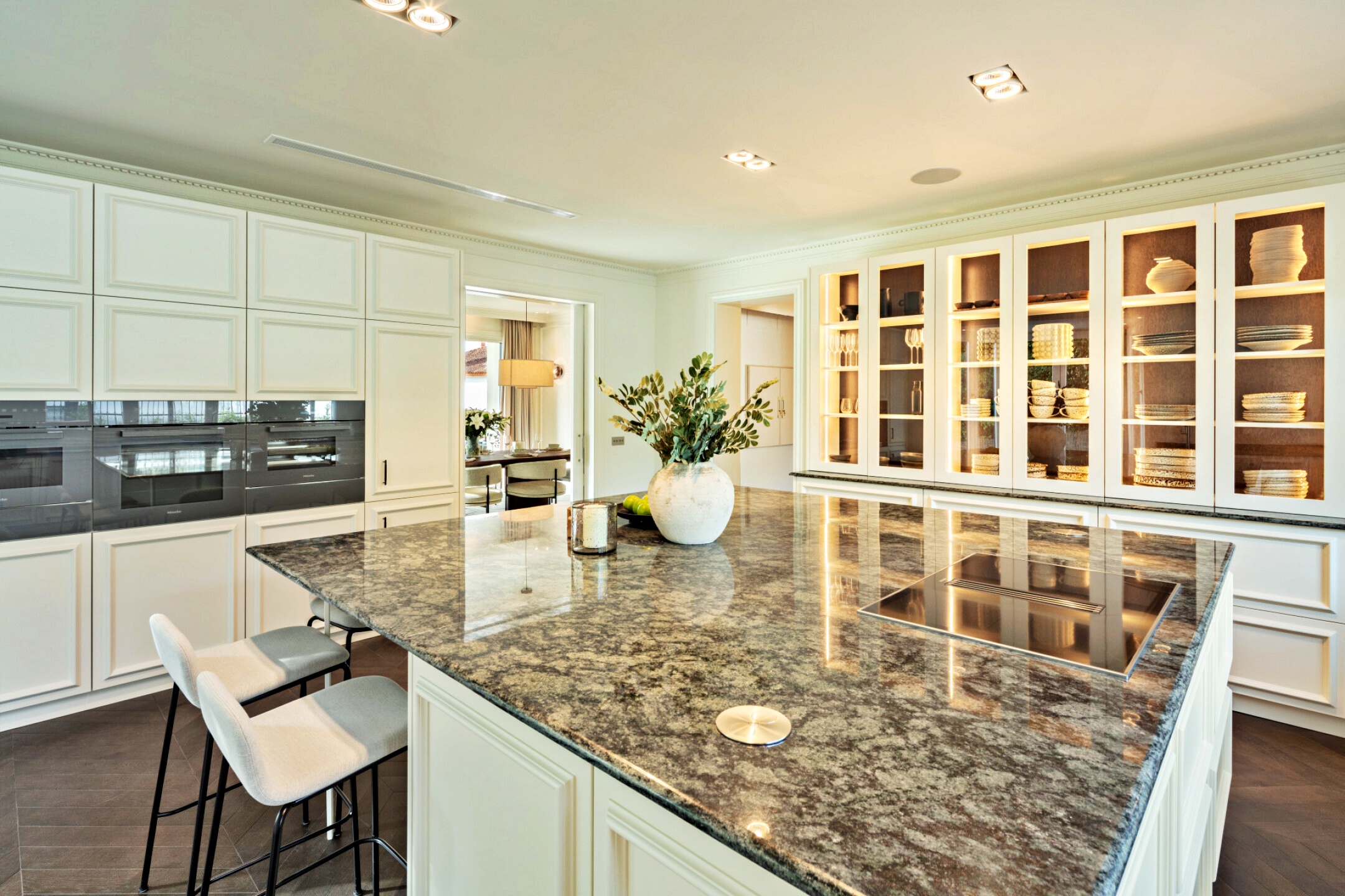 Designed in a classic style with refined architectural details, the home unfolds across three levels of luxurious living. The grand living room, anchored by a stately fireplace, flows seamlessly into a formal dining area and a fully equipped kitchen with a charming breakfast bar — perfect for family gatherings or leisurely mornings.