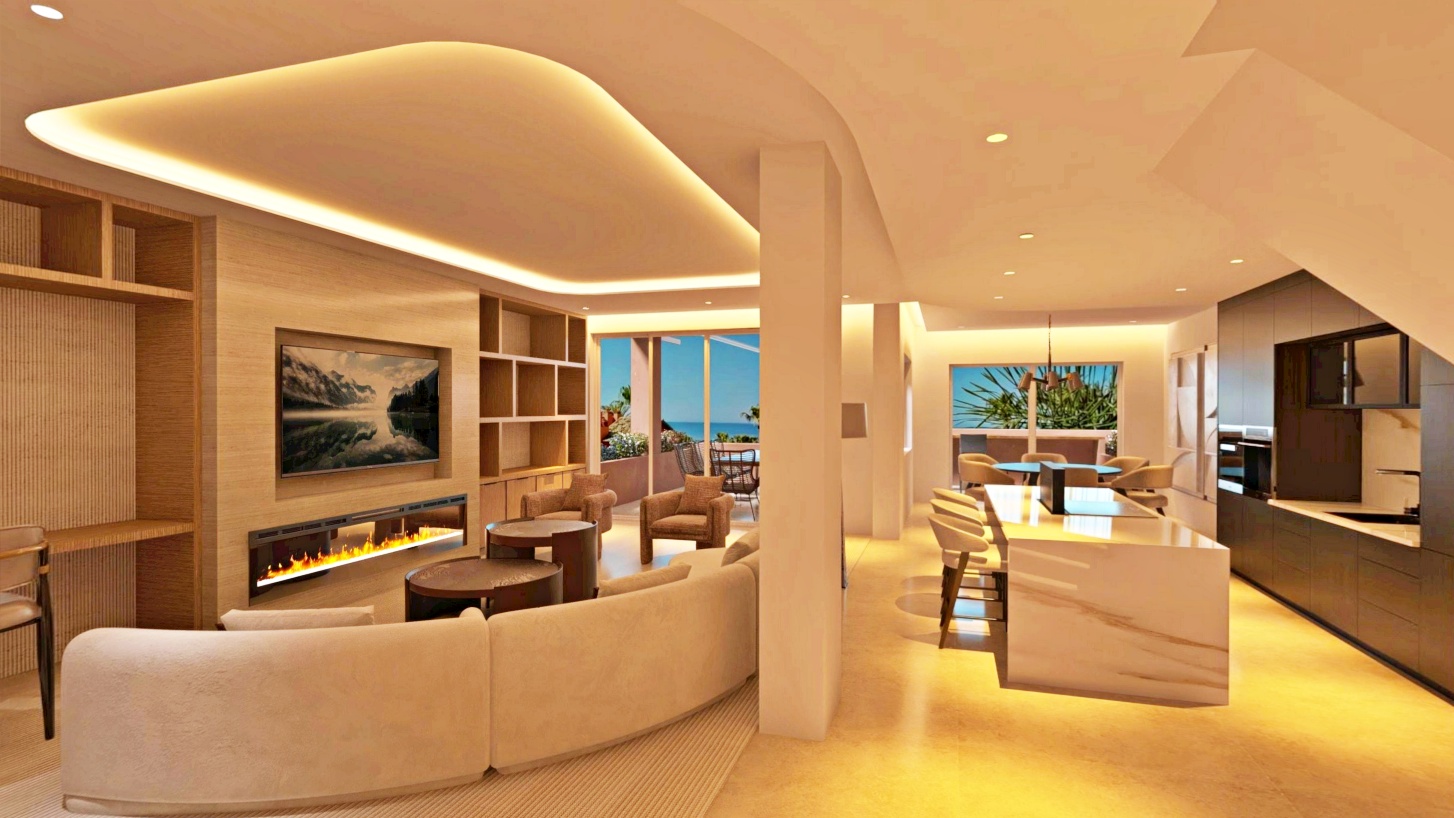 Spanning over 200 square metres of interior living space and complemented by 125 square metres of private terraces, the home is thoughtfully curated to balance comfort and style. The open-plan living area is bathed in natural light, centred around an elegant electric fireplace that creates a warm and inviting atmosphere. Every detail has been carefully considered, from custom-built wardrobes and a designer kitchen equipped with premium appliances—including a Thermomix and wine fridge—to a Bang & Olufsen integrated sound system that enhances the home’s contemporary appeal.