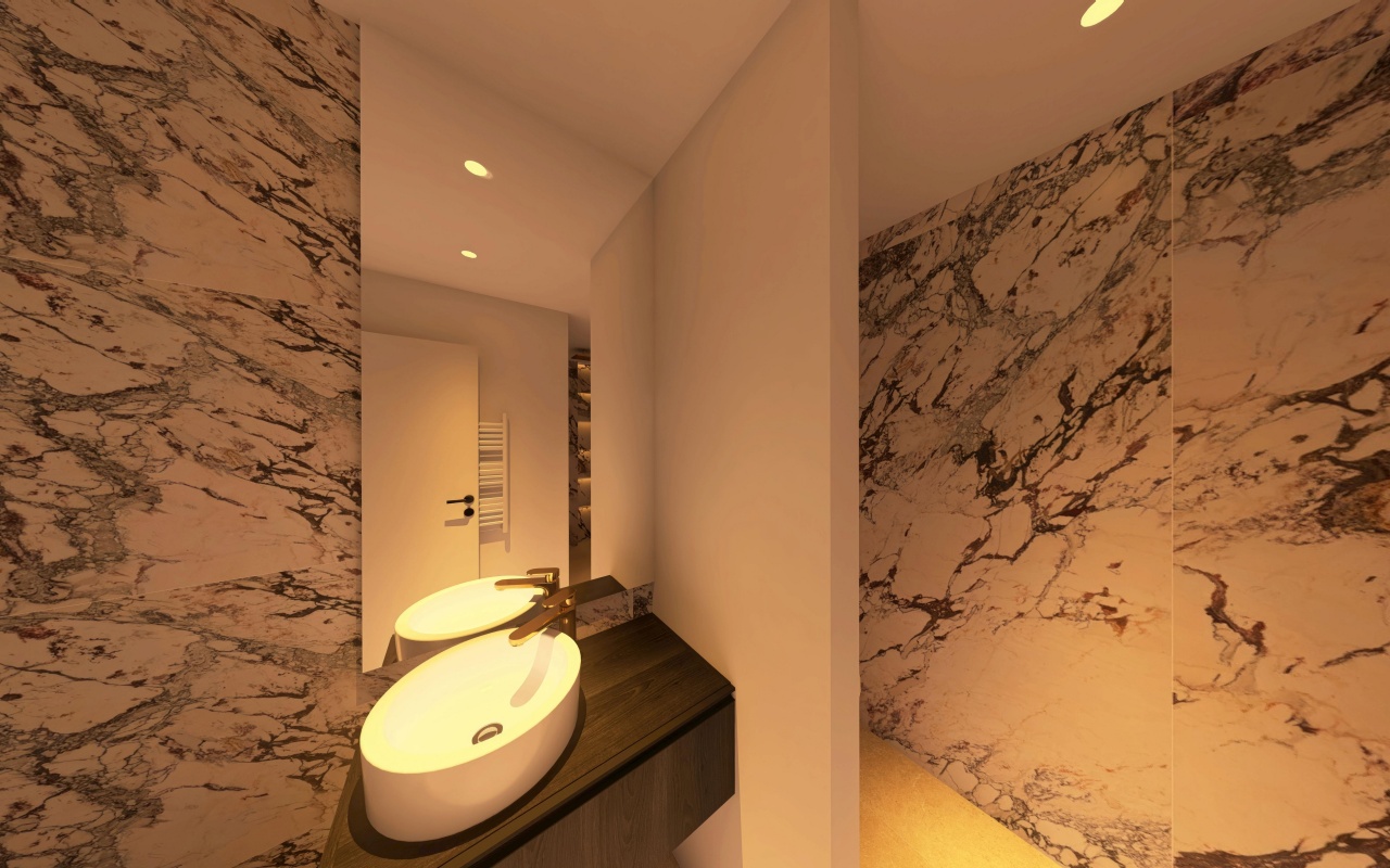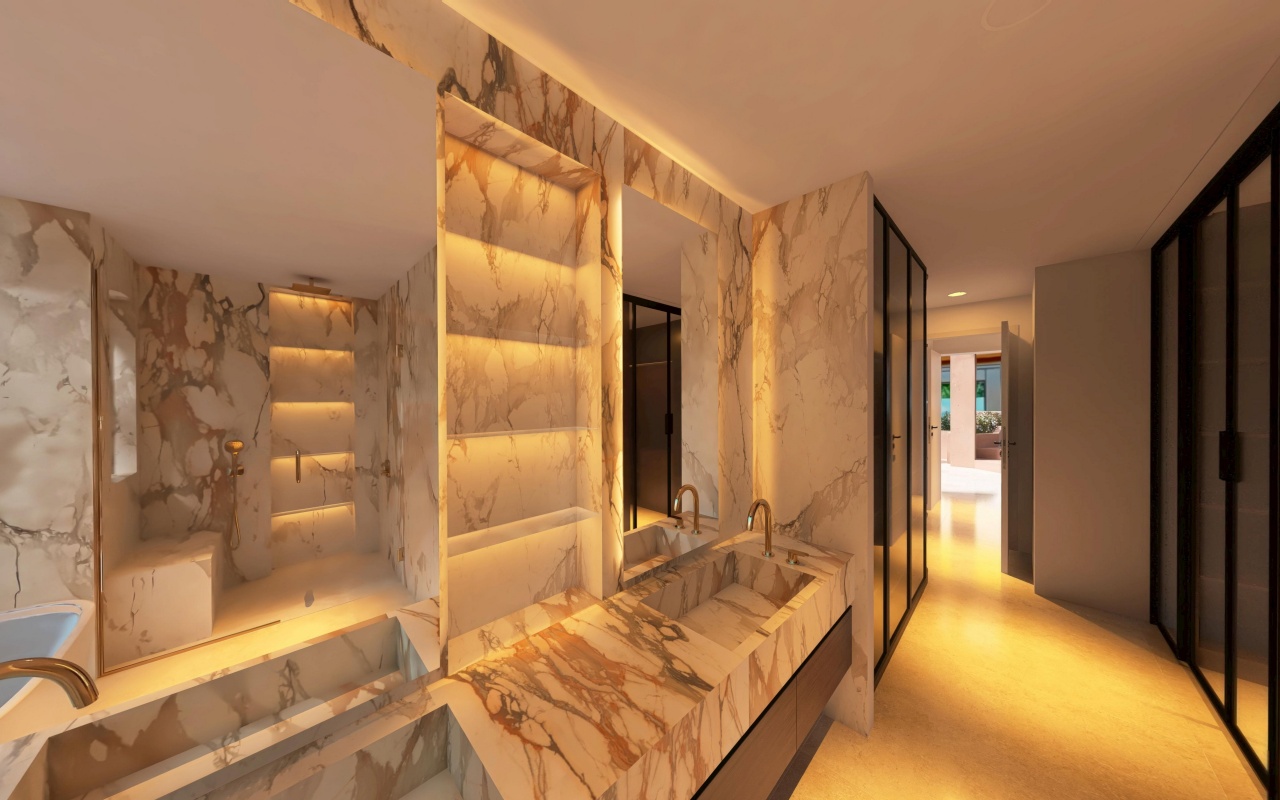 The primary suite serves as a private retreat, featuring a luxurious walk-in closet, a free-standing bathtub, and direct access to the upper terrace. The outdoor spaces redefine coastal living, offering a secluded sun terrace furnished with Kettal pieces, a private sauna, and a jacuzzi—perfect for unwinding after a day on the beach or the nearby golf courses.