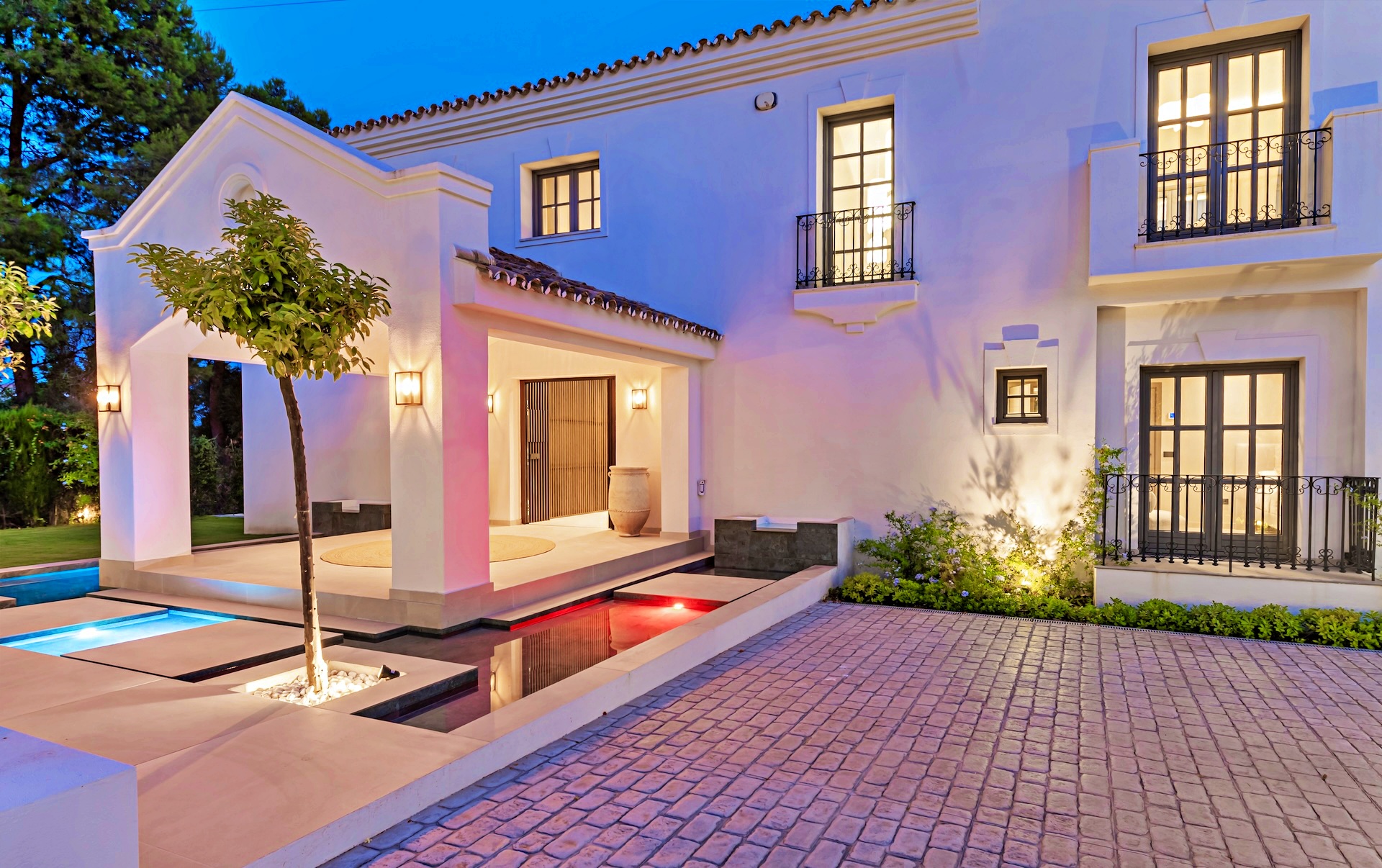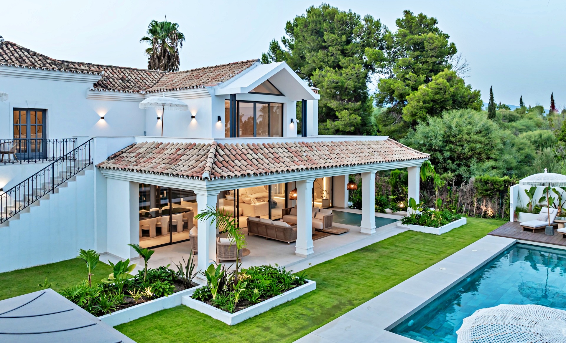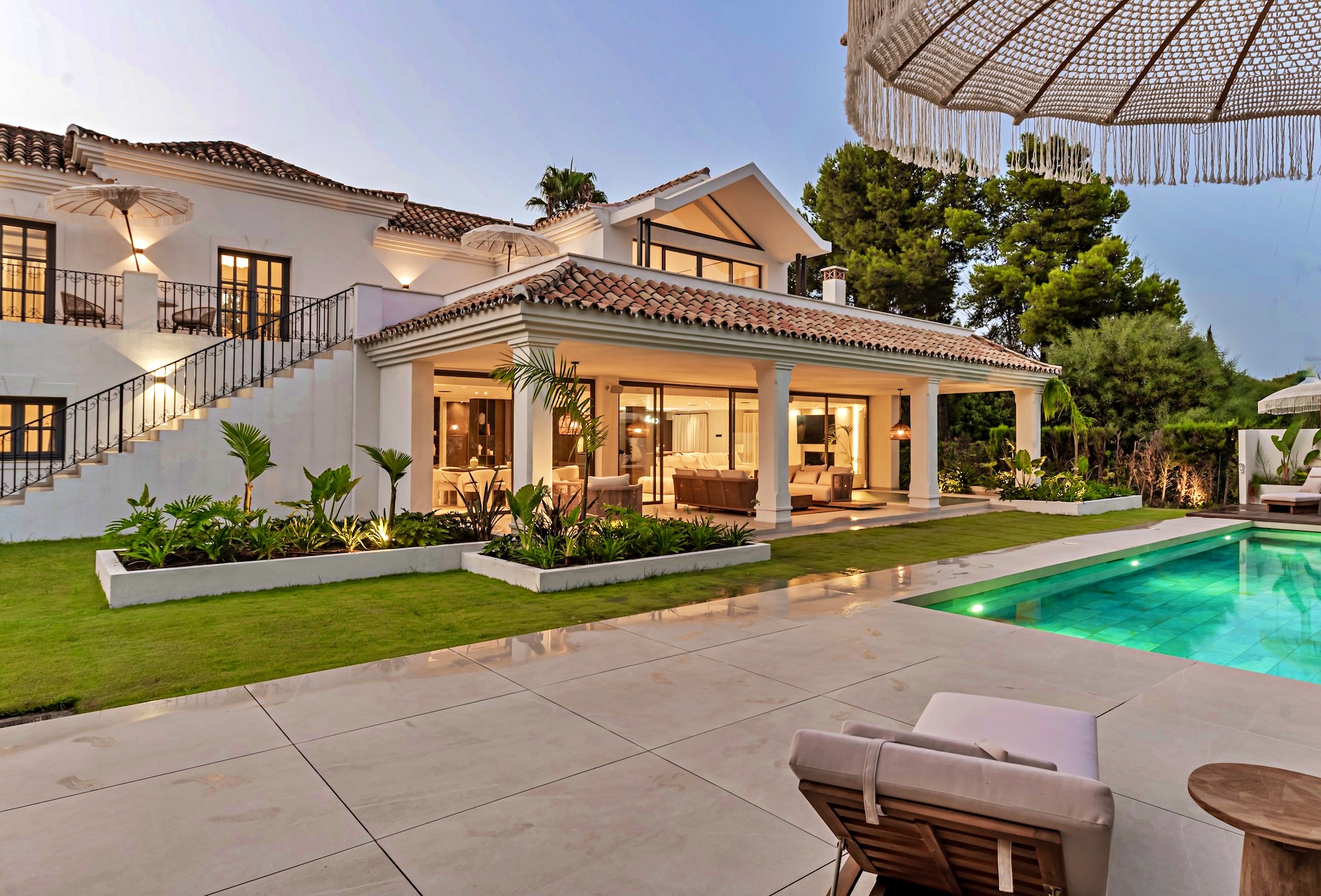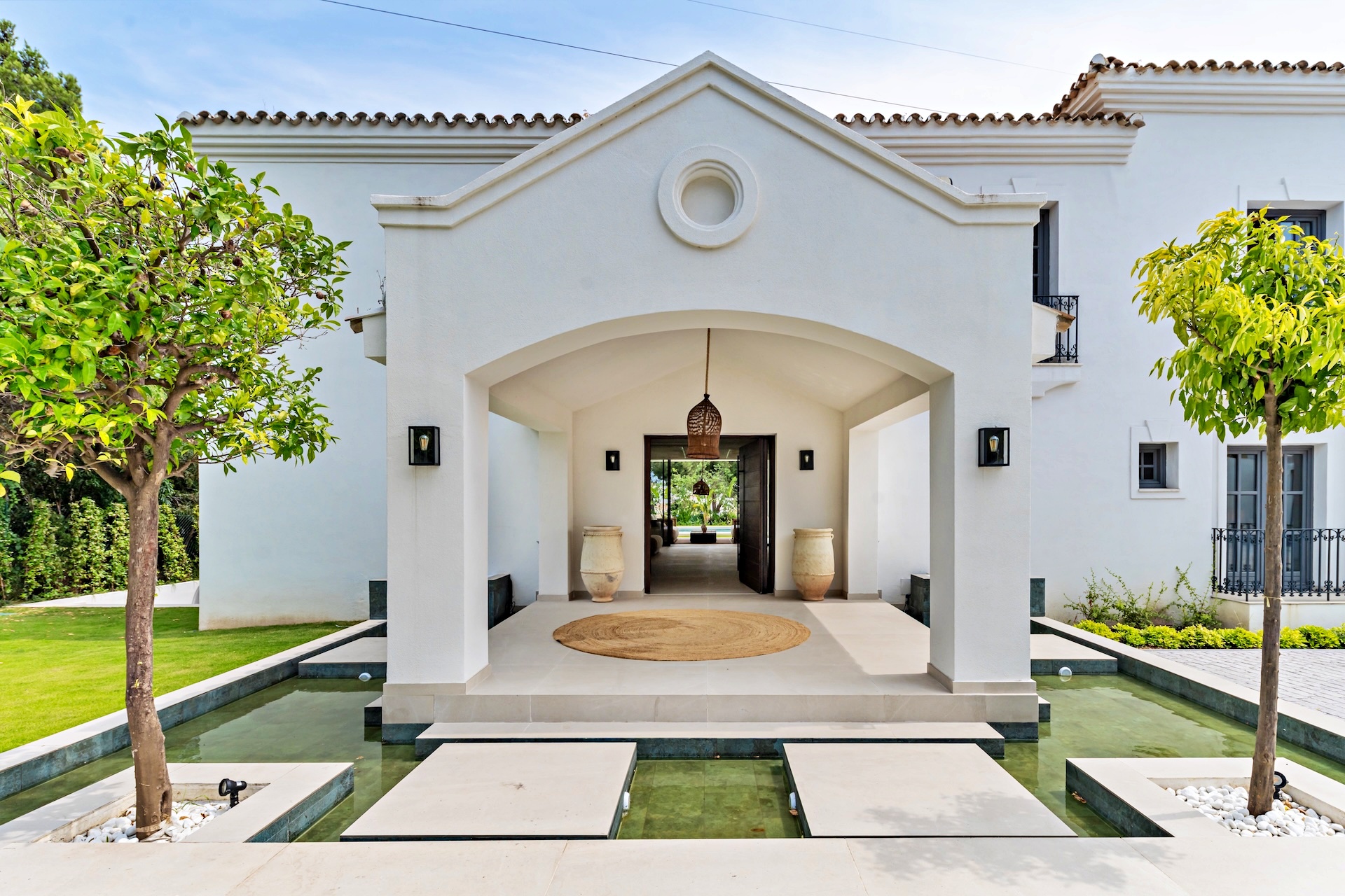 Just moments from the prestigious Atalaya Golf Club, this exquisite villa captures the essence of Andalusian charm while embracing the sophistication of modern living. Nestled amid mature trees and manicured gardens, the property offers a tranquil sanctuary where timeless architecture meets contemporary refinement.