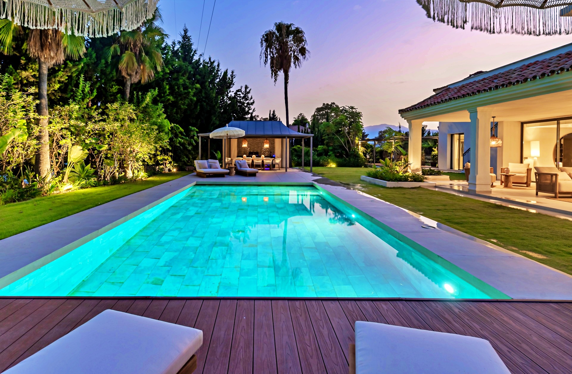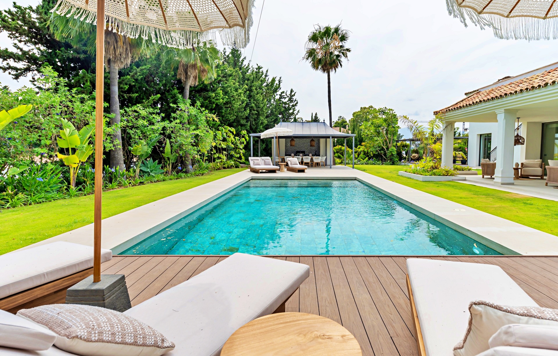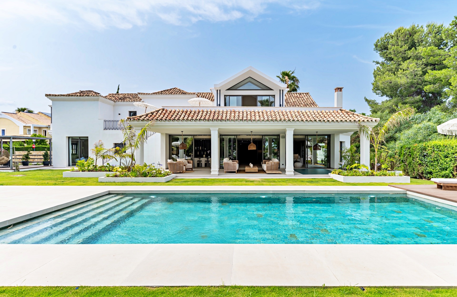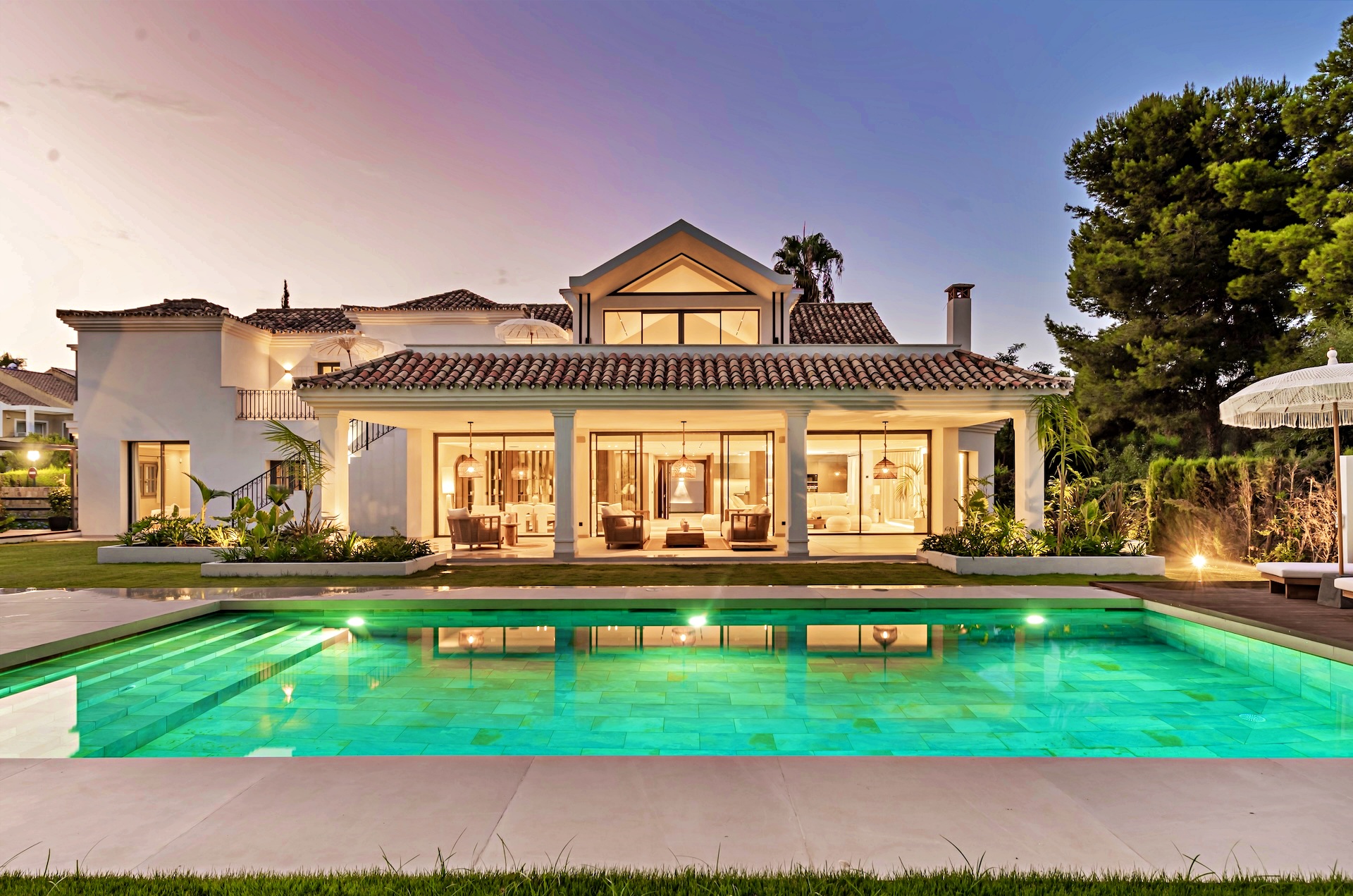 Just moments from the prestigious Atalaya Golf Club, this exquisite villa captures the essence of Andalusian charm while embracing the sophistication of modern living. Nestled amid mature trees and manicured gardens, the property offers a tranquil sanctuary where timeless architecture meets contemporary refinement.