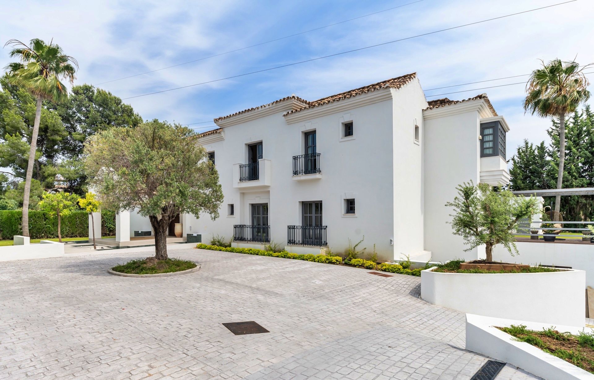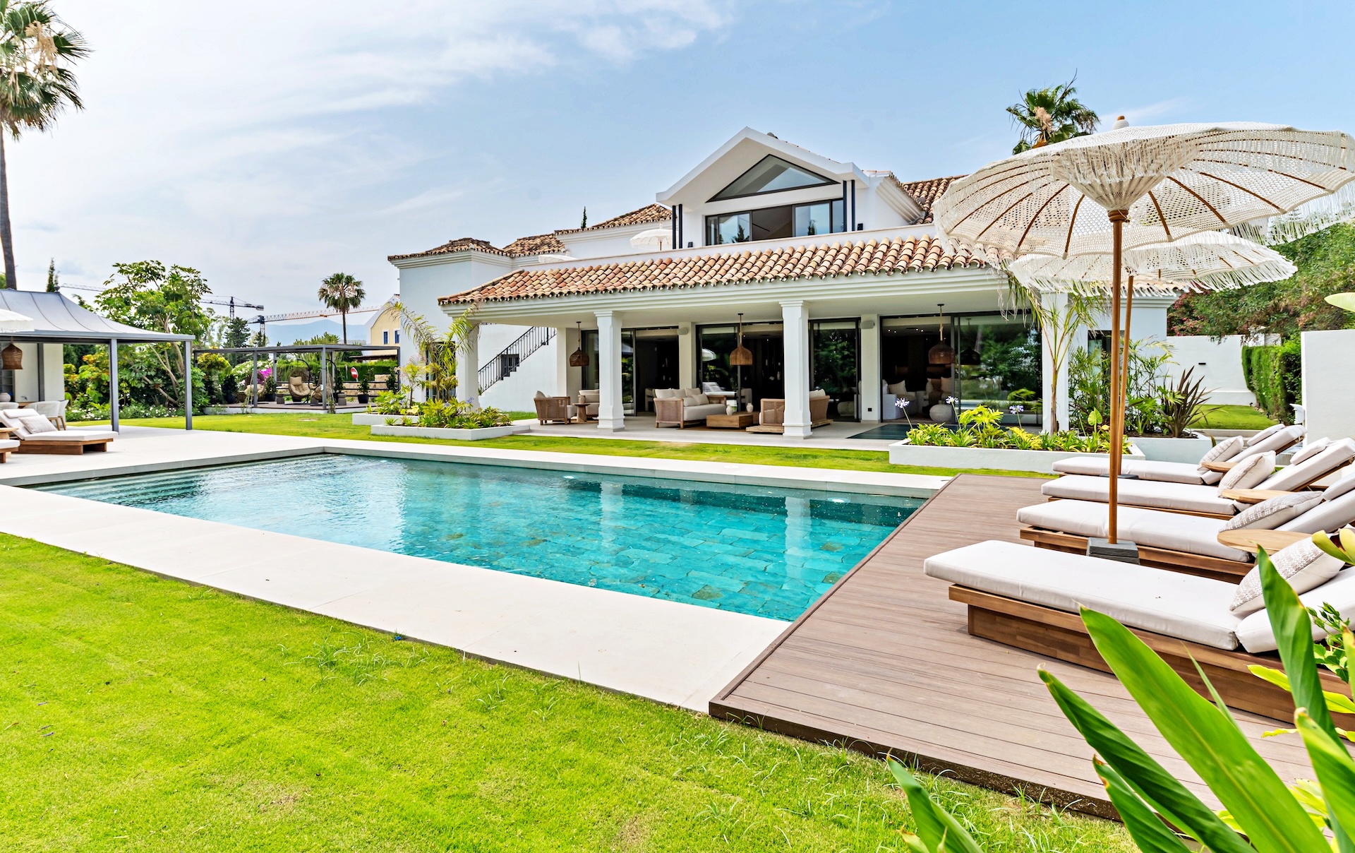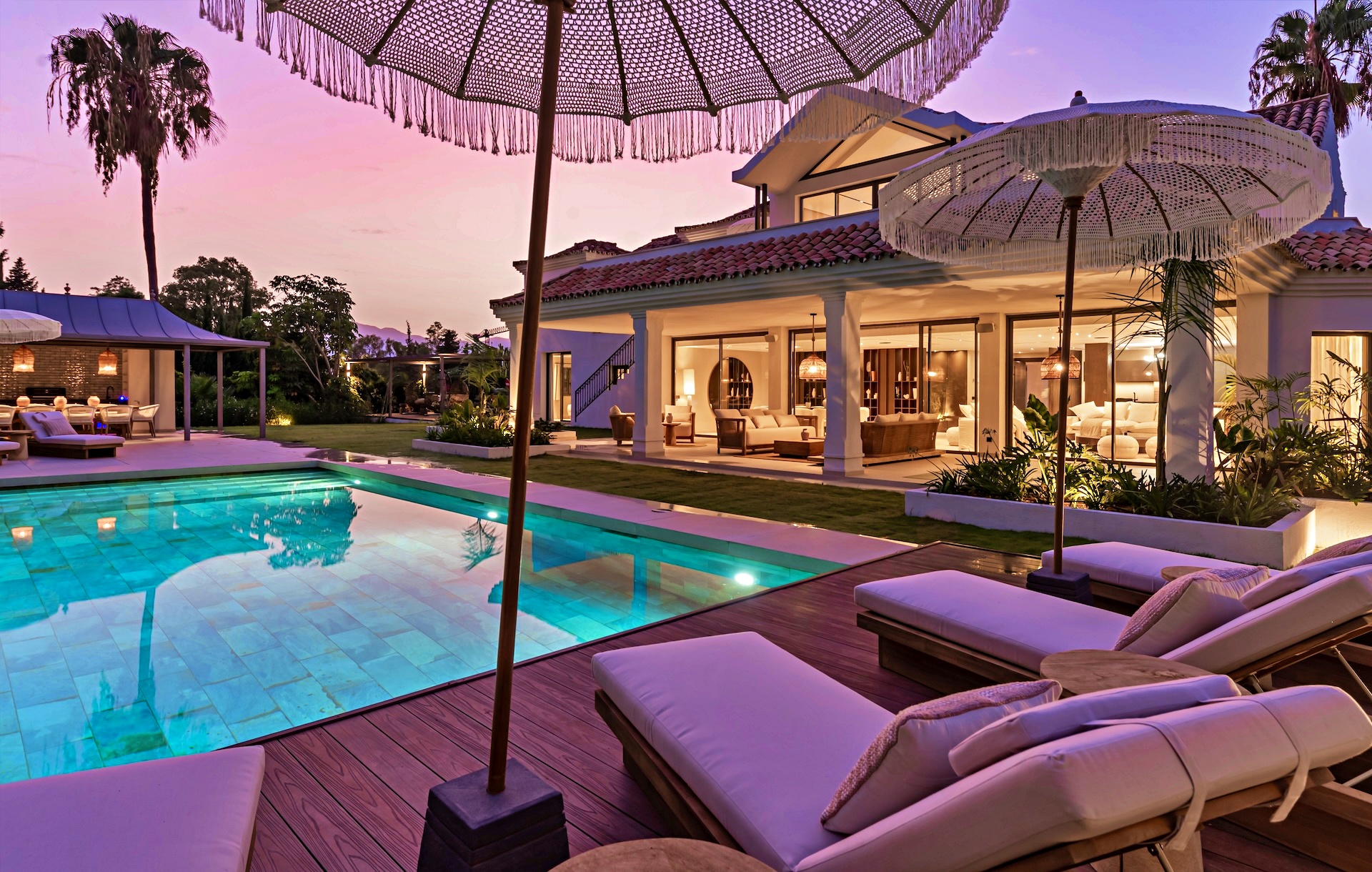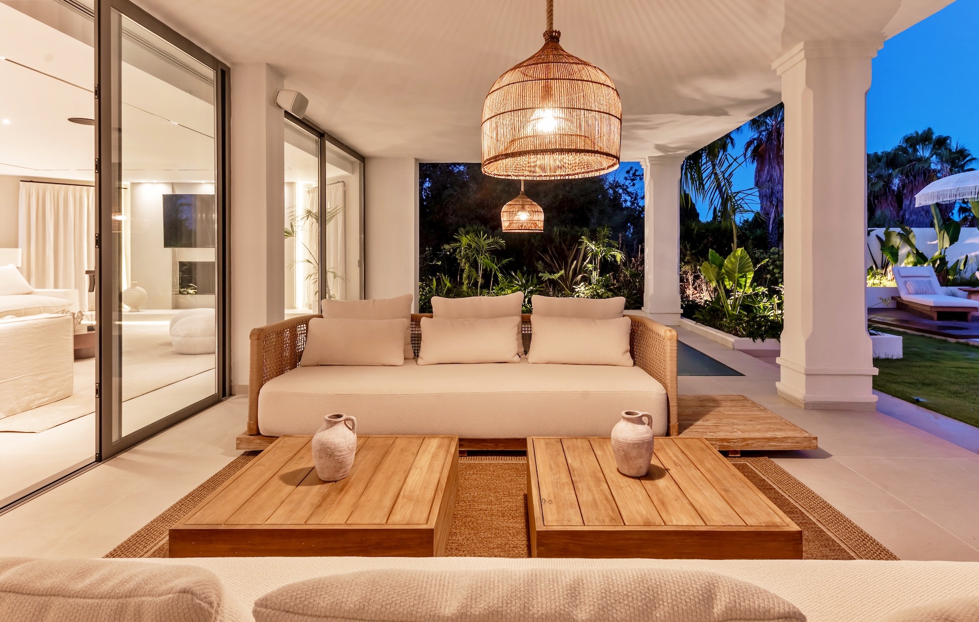 Just moments from the prestigious Atalaya Golf Club, this exquisite villa captures the essence of Andalusian charm while embracing the sophistication of modern living. Nestled amid mature trees and manicured gardens, the property offers a tranquil sanctuary where timeless architecture meets contemporary refinement.