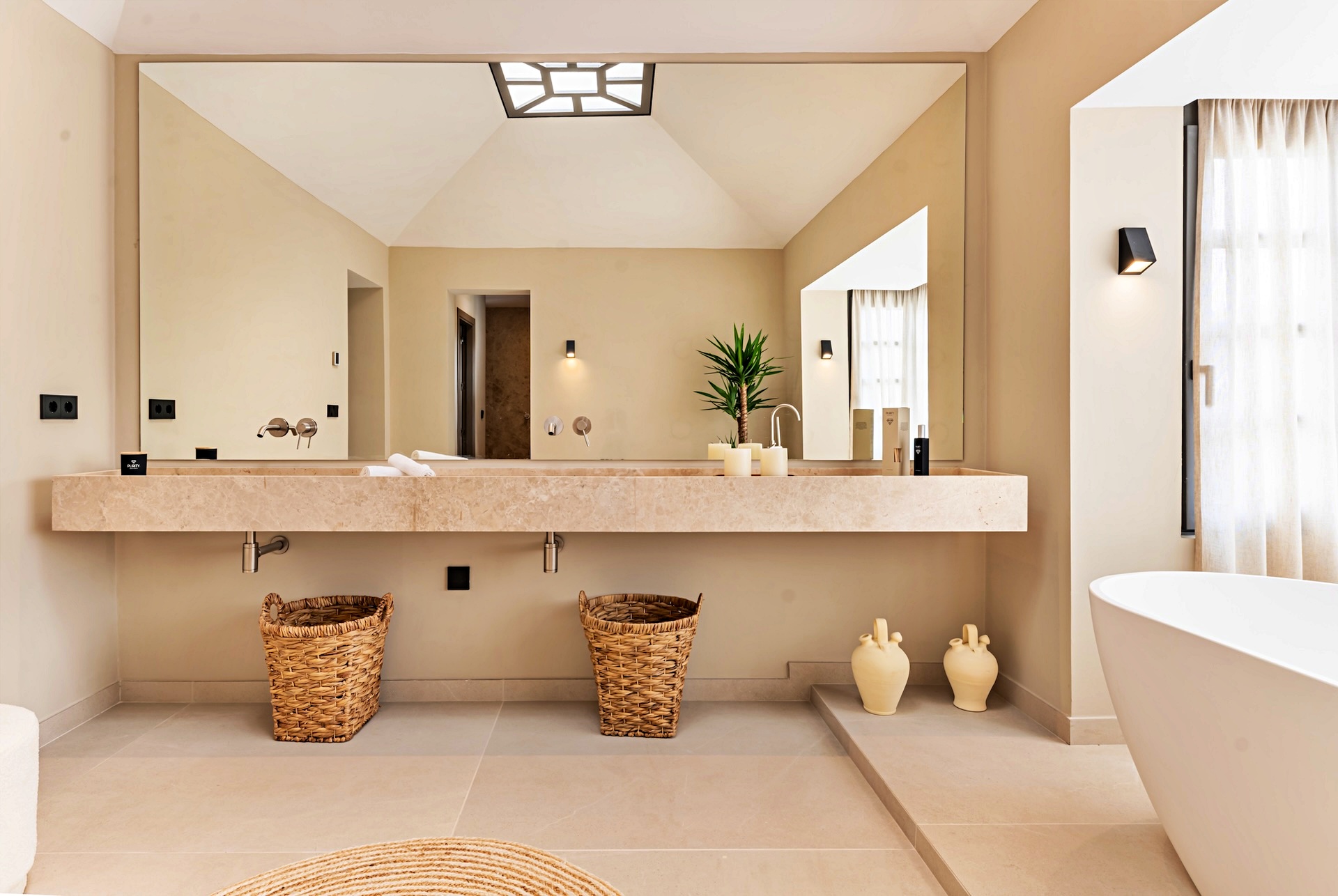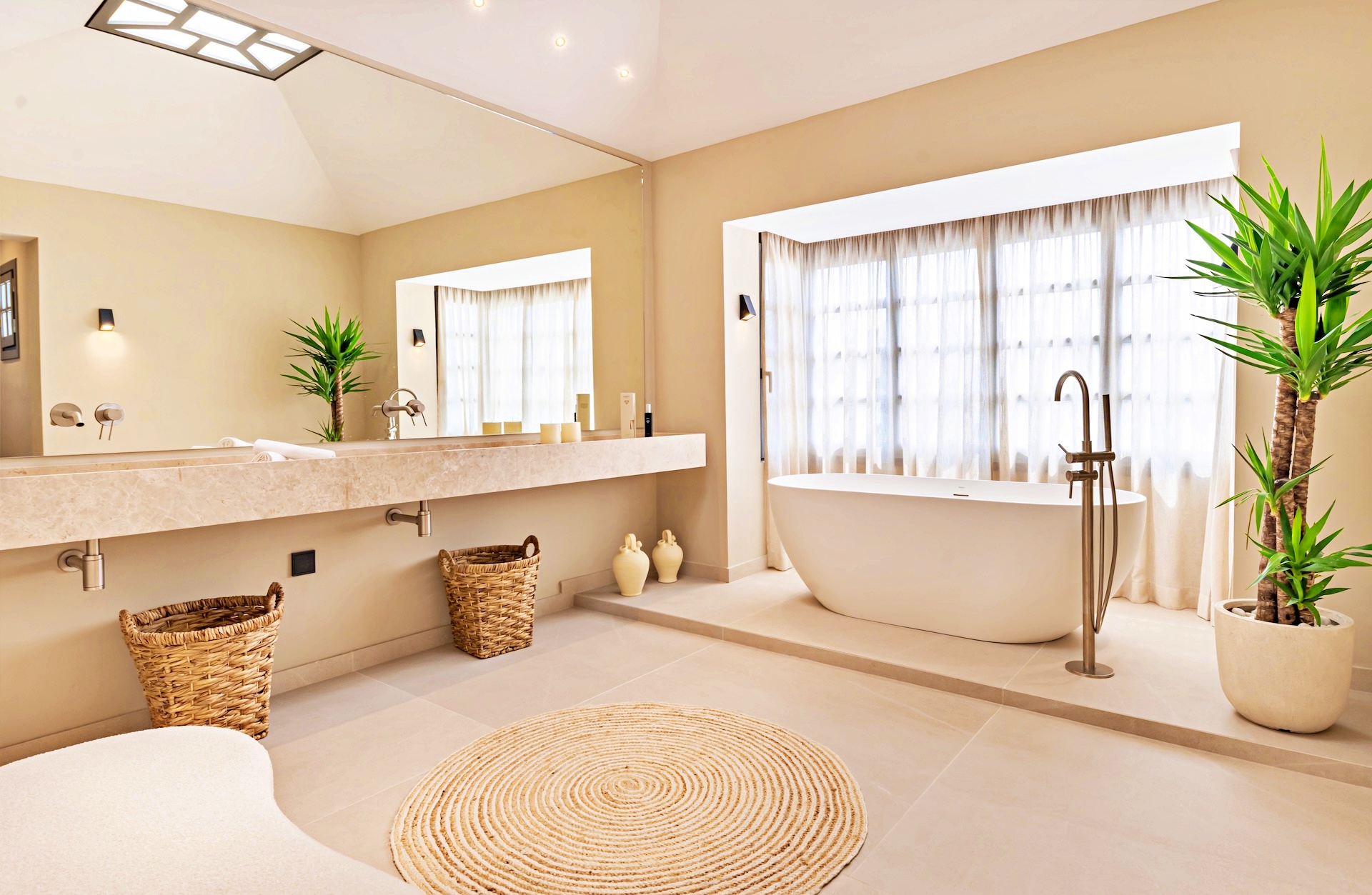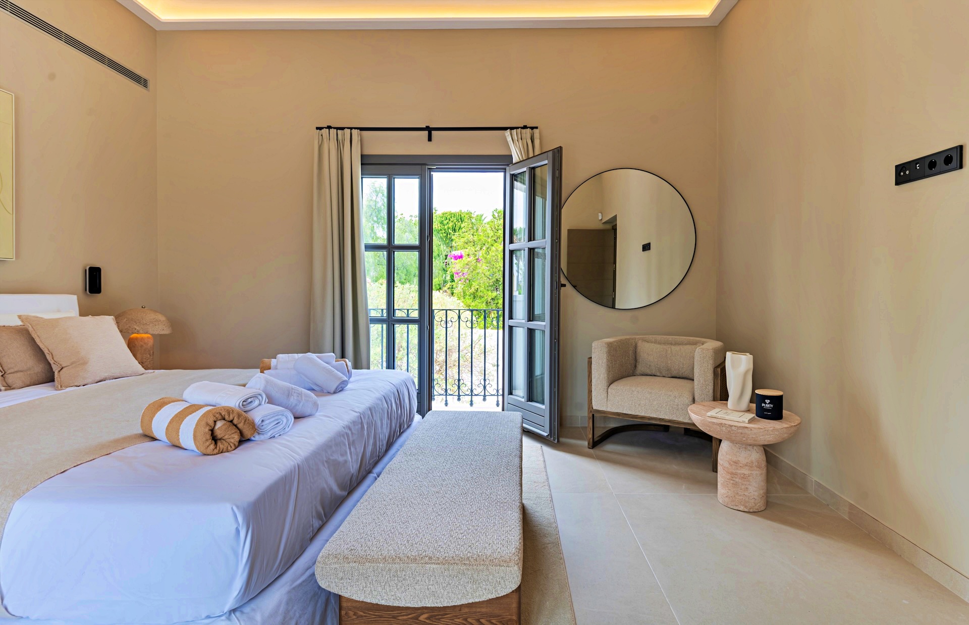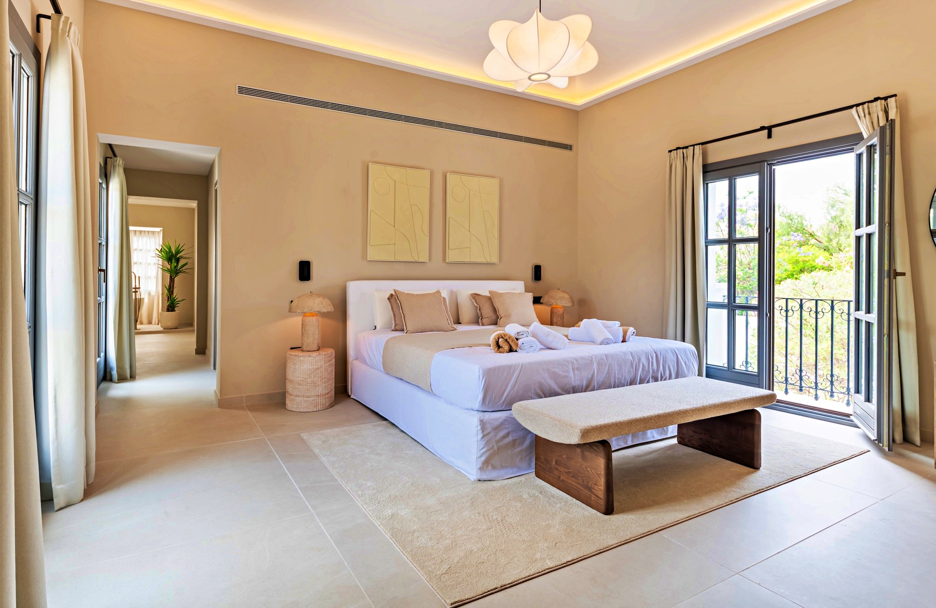 Two master suites evoke the spirit of a Mediterranean retreat, each featuring spa-inspired bathrooms and serene views of the lush gardens. Every detail has been curated to create an atmosphere of understated luxury and comfort.