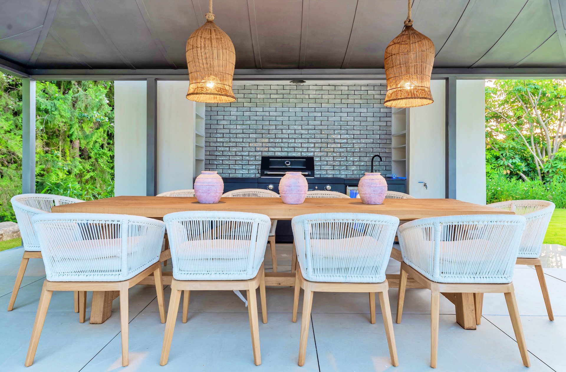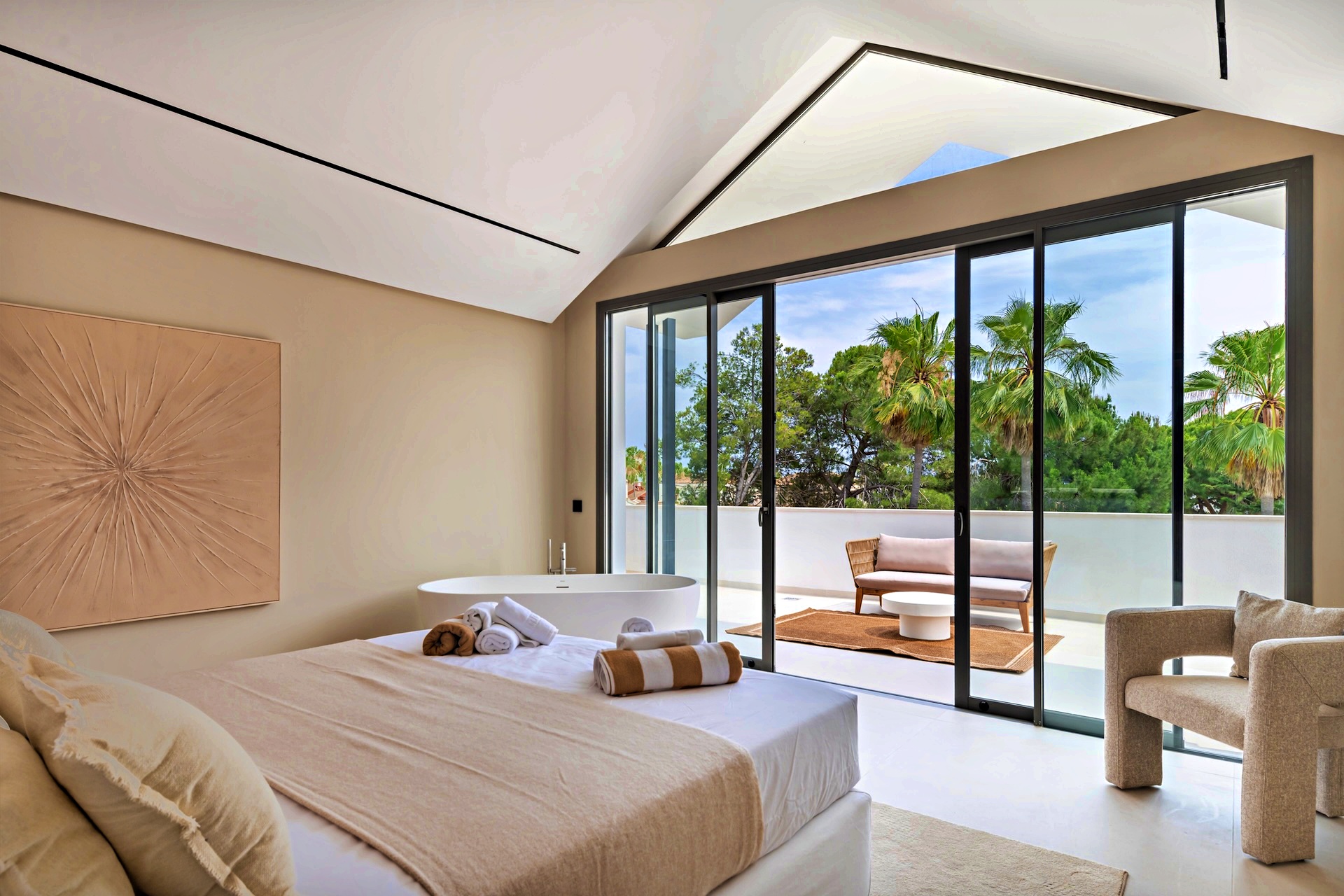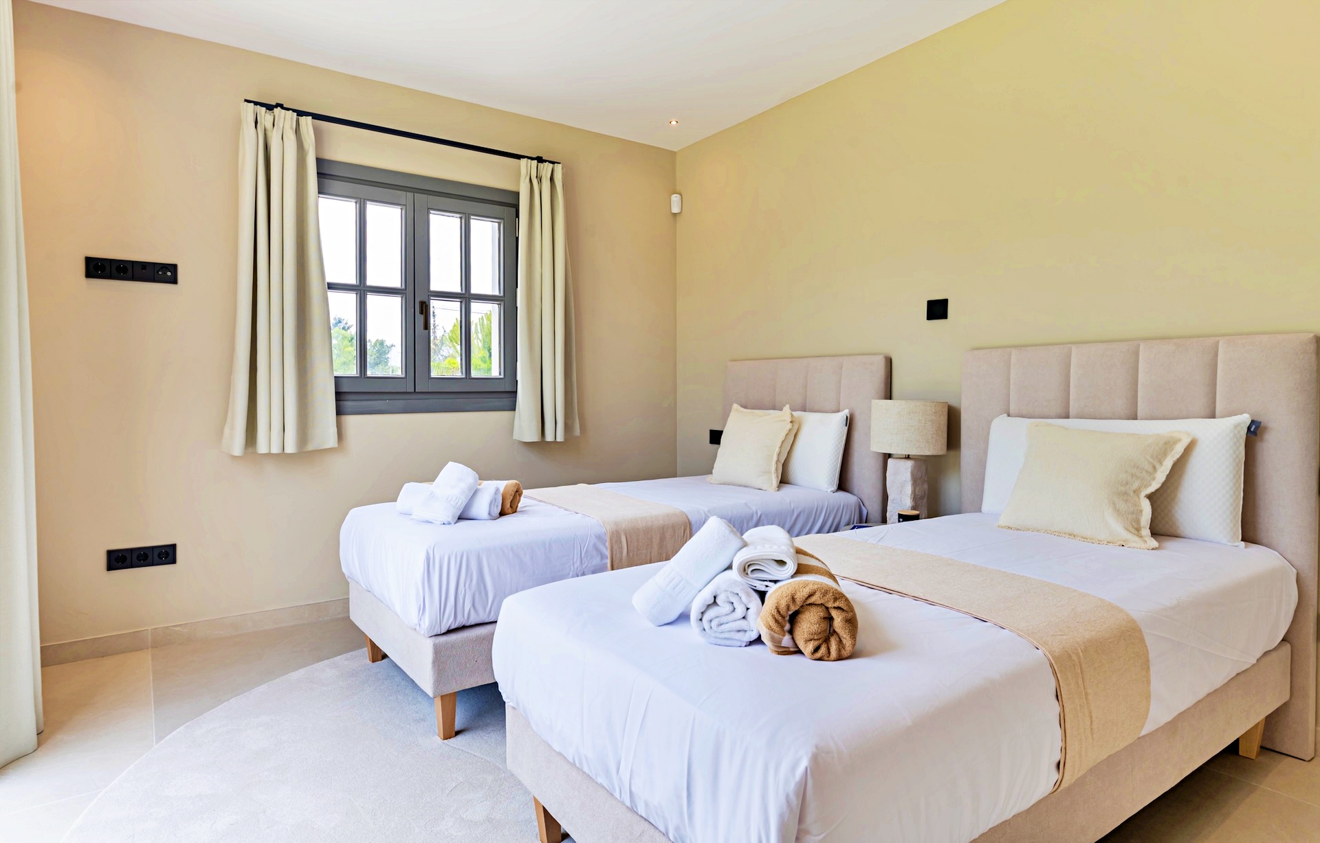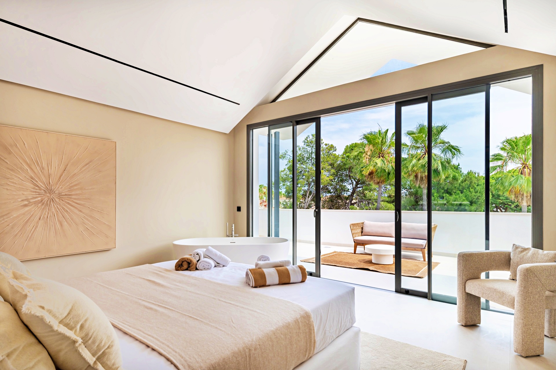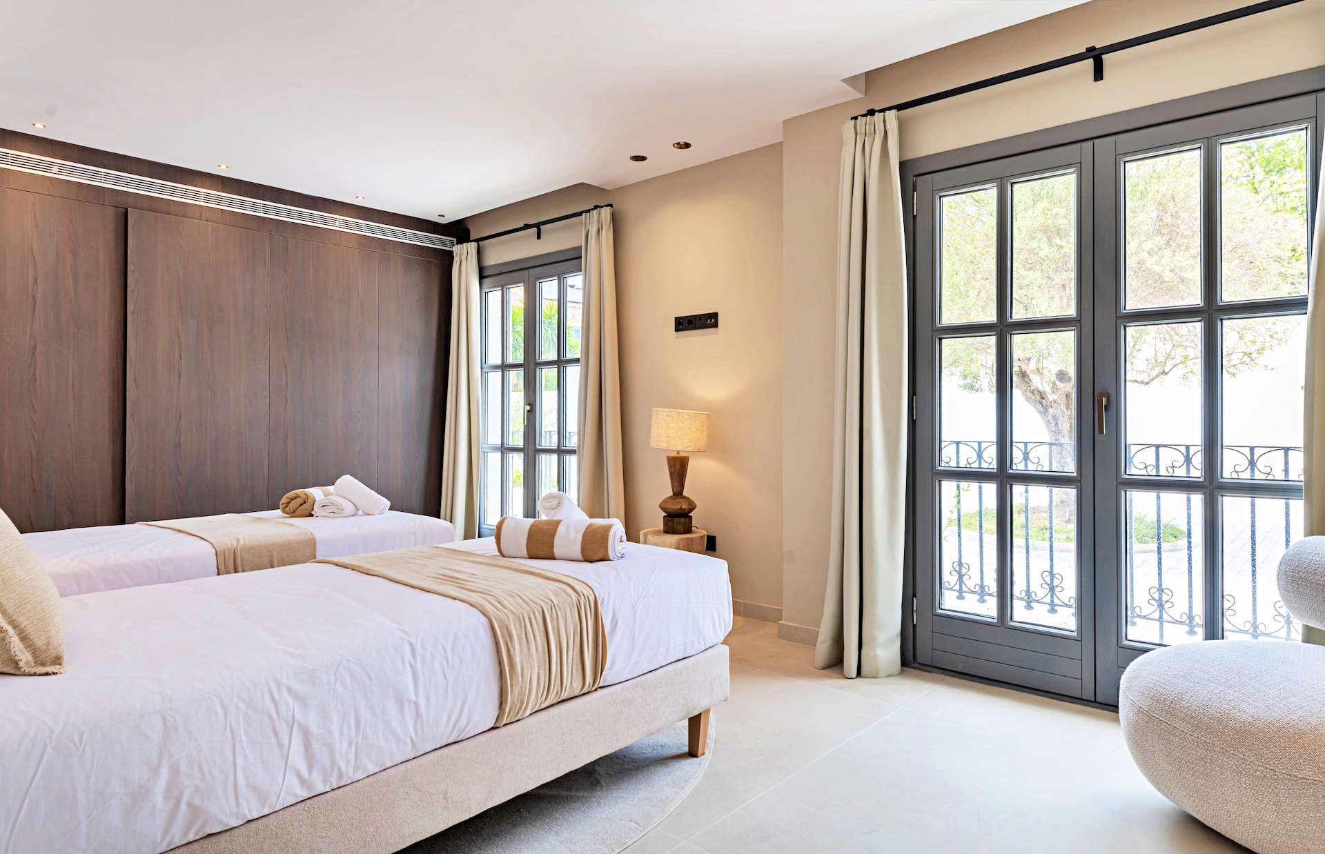Two master suites evoke the spirit of a Mediterranean retreat, each featuring spa-inspired bathrooms and serene views of the lush gardens. Every detail has been curated to create an atmosphere of understated luxury and comfort.