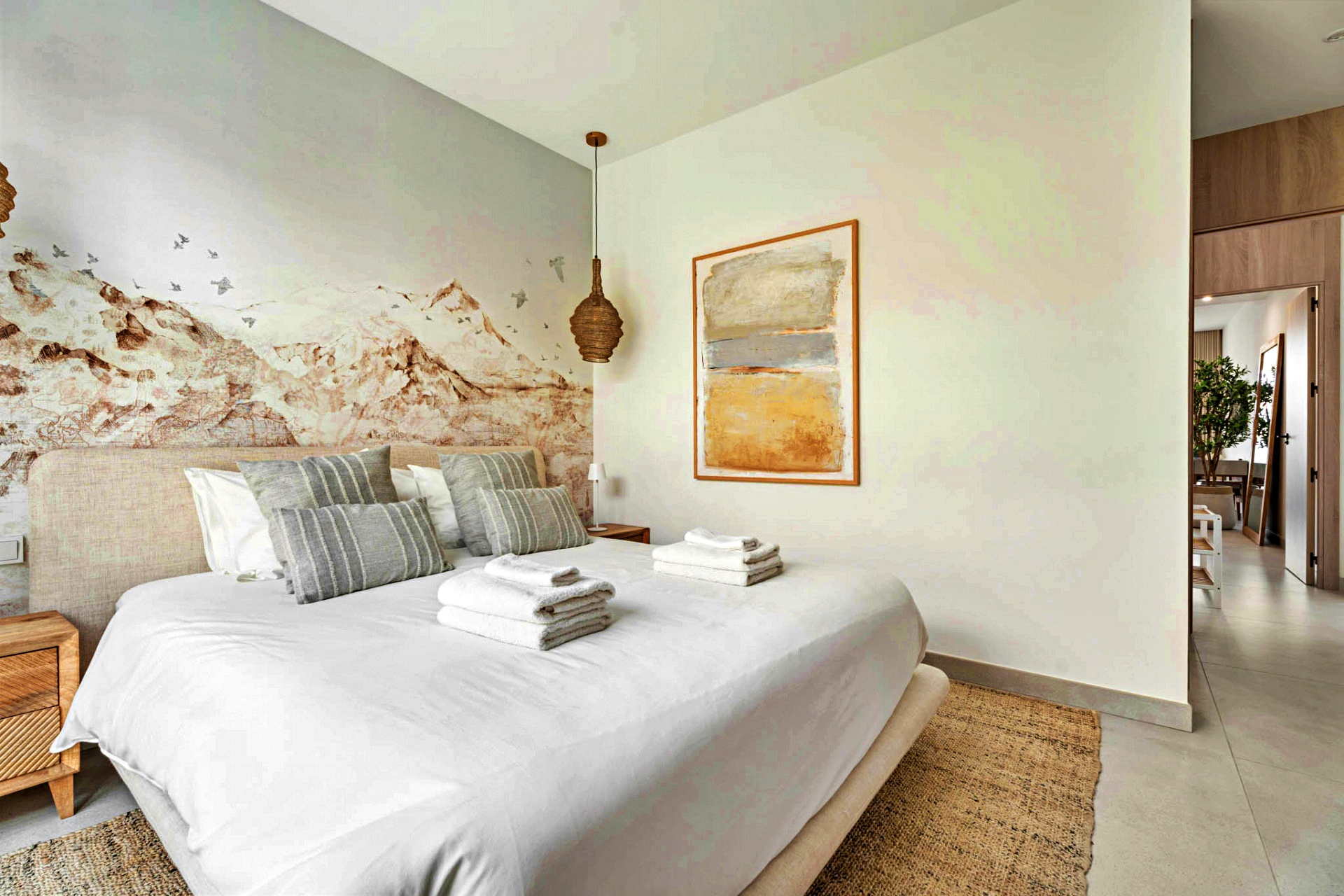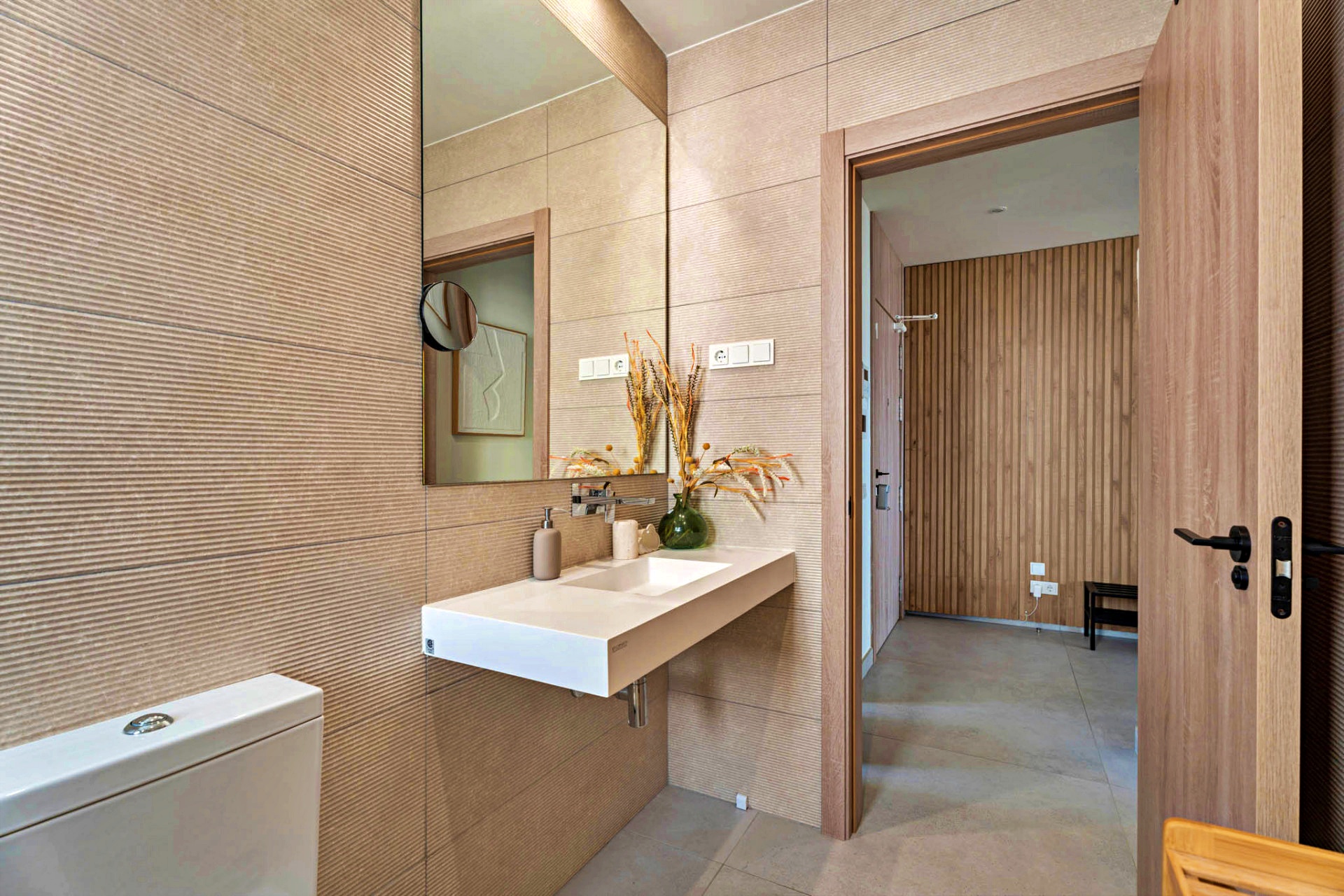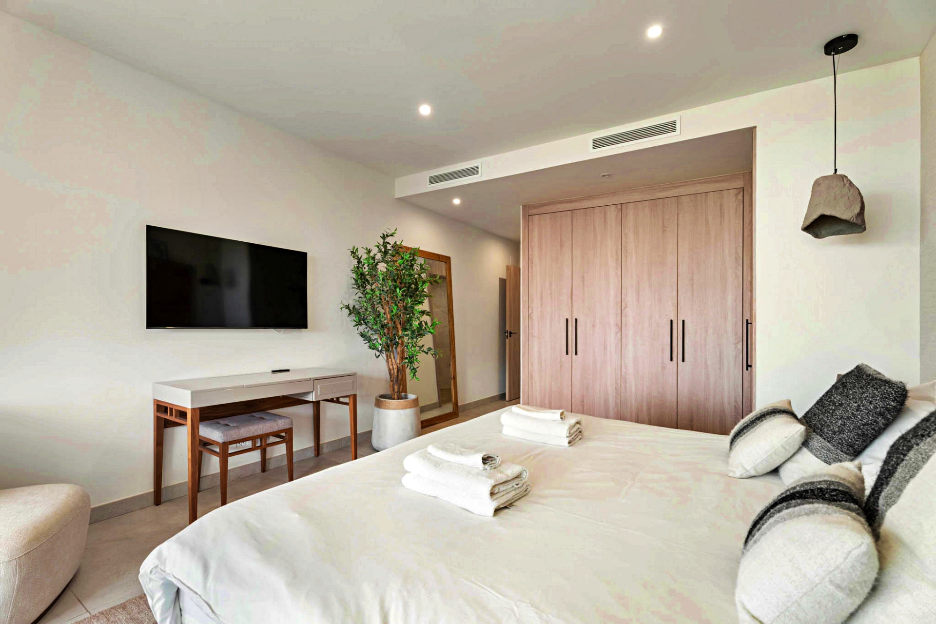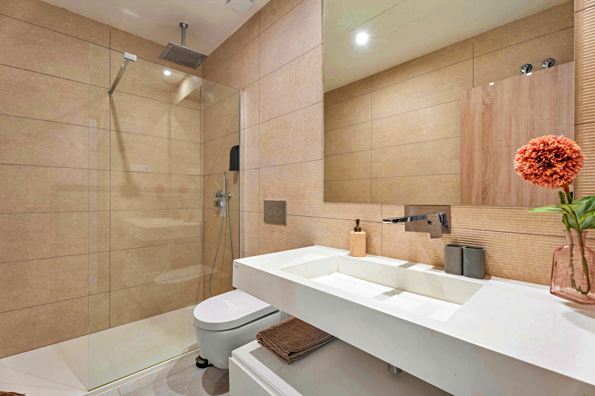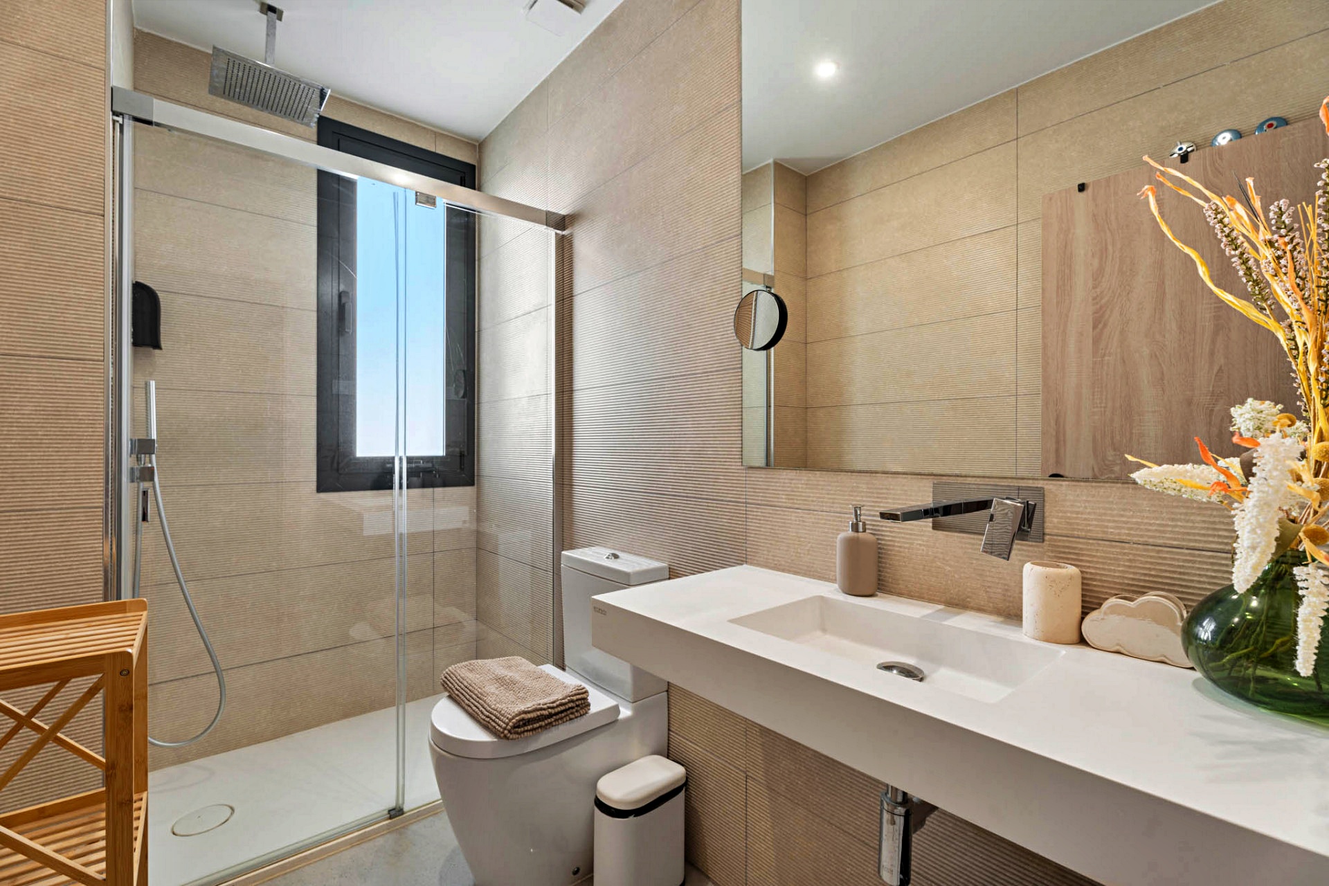 Three beautifully appointed bedrooms are thoughtfully arranged for privacy and relaxation. The primary suite, a serene retreat of 21 m², features a walk-in dressing area, an elegant en-suite bathroom, and direct access to the terrace — the perfect spot for morning coffee with a sea view. A guest suite with its own bathroom and a third bedroom with fitted wardrobes complete this level, along with a separate full bathroom.