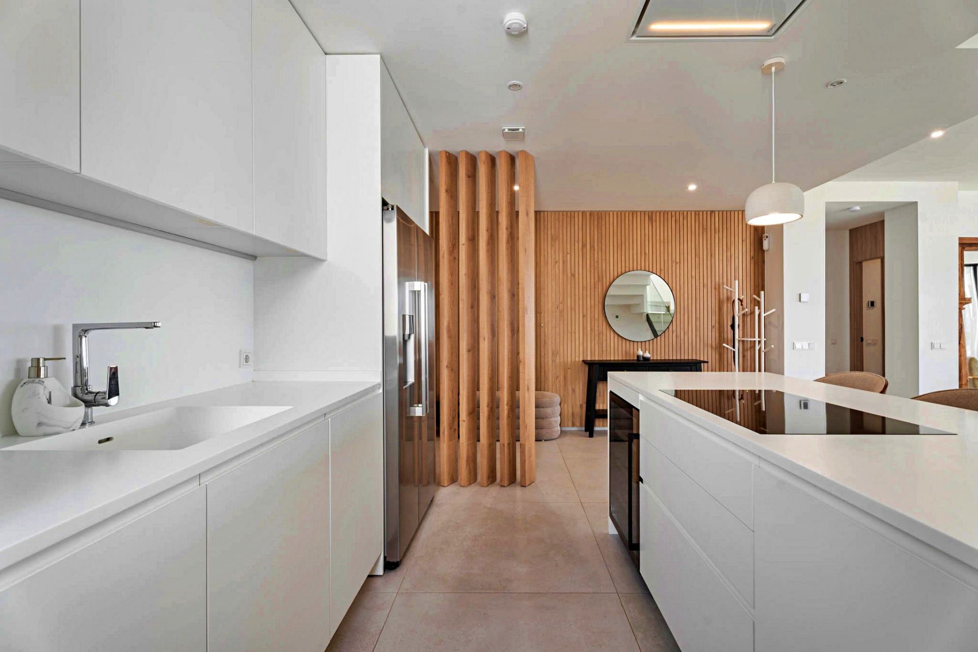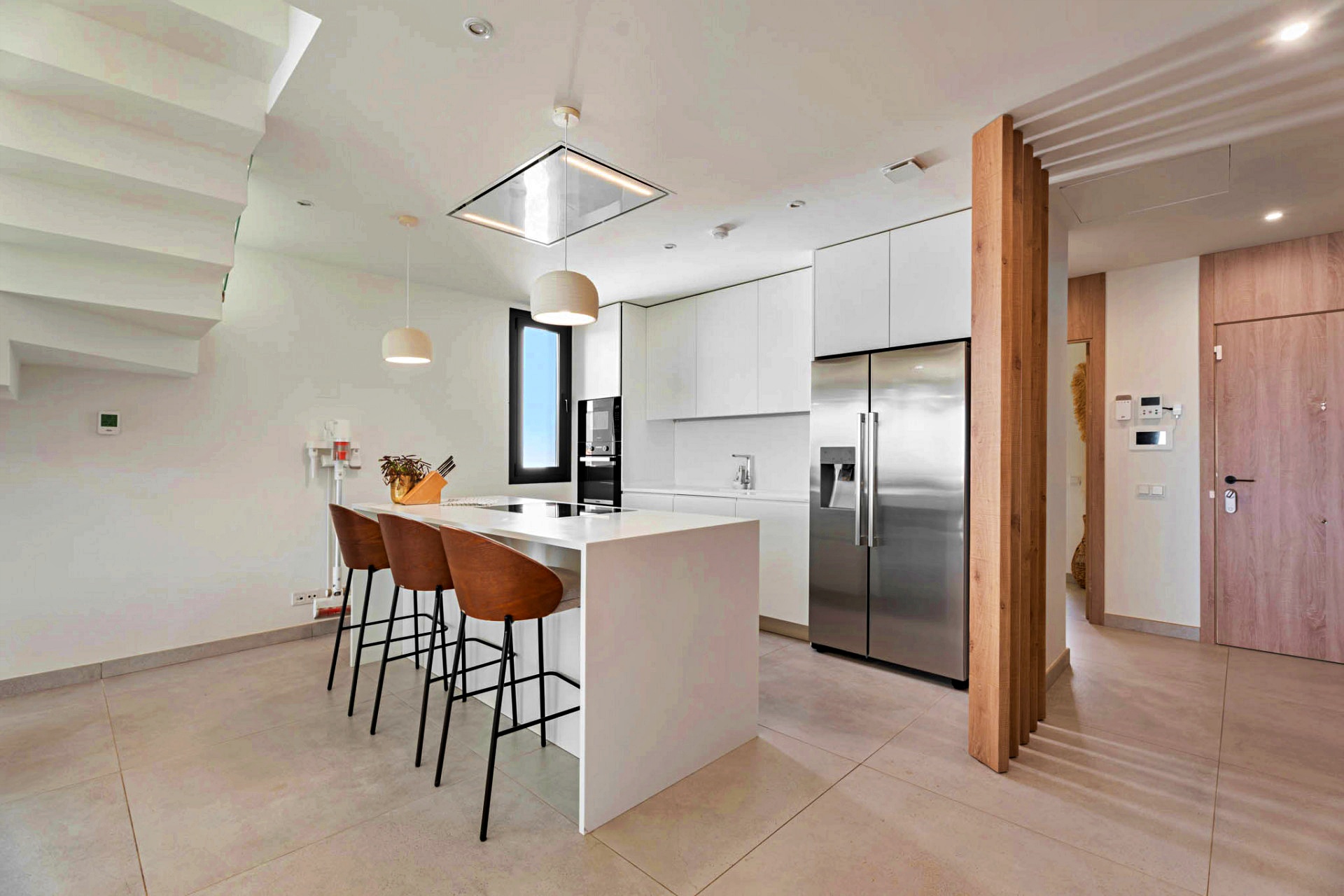 Bathed in natural light, the main floor welcomes you into a spacious open-plan living and dining area that flows seamlessly onto a generous terrace overlooking the Mediterranean. Floor-to-ceiling windows blur the boundaries between indoors and out, allowing the sea breeze and sunlight to fill every corner. The sleek, modern kitchen — perfectly balanced in form and function — anchors the space as the social heart of the home.