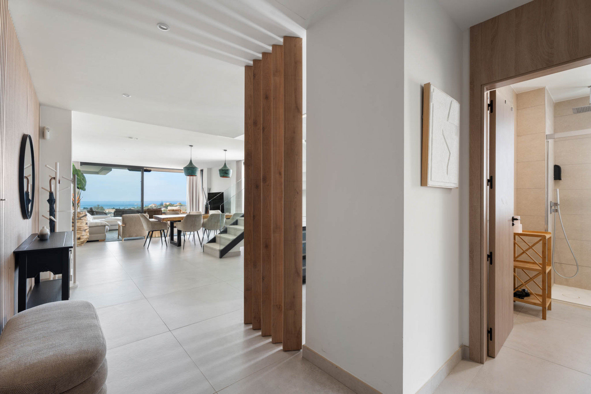 Ascend to the upper floor and discover the showpiece of the penthouse — a spectacular solarium of 123 m². This elevated oasis offers a private pool, expansive sun terraces, and breathtaking panoramic views of the Mediterranean Sea. Whether lounging under the sun, hosting sunset dinners, or stargazing at night, this space captures the essence of Marbella’s outdoor lifestyle.