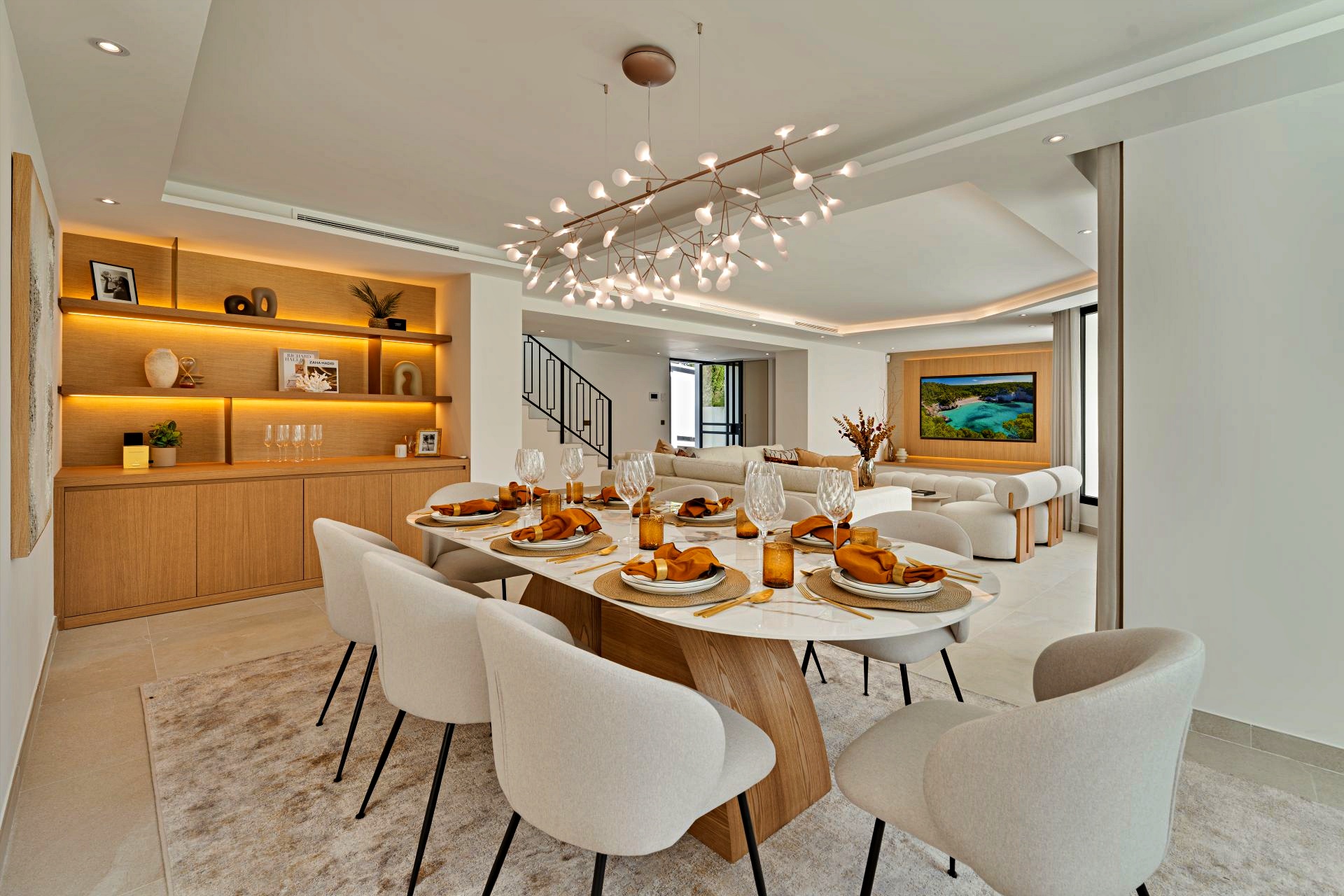 Security and convenience are woven into the villa’s design, with a gated entrance, private garage, and security shutters ensuring peace of mind. Offered fully furnished, the home’s minimalist yet luxurious aesthetic makes it completely move-in ready.