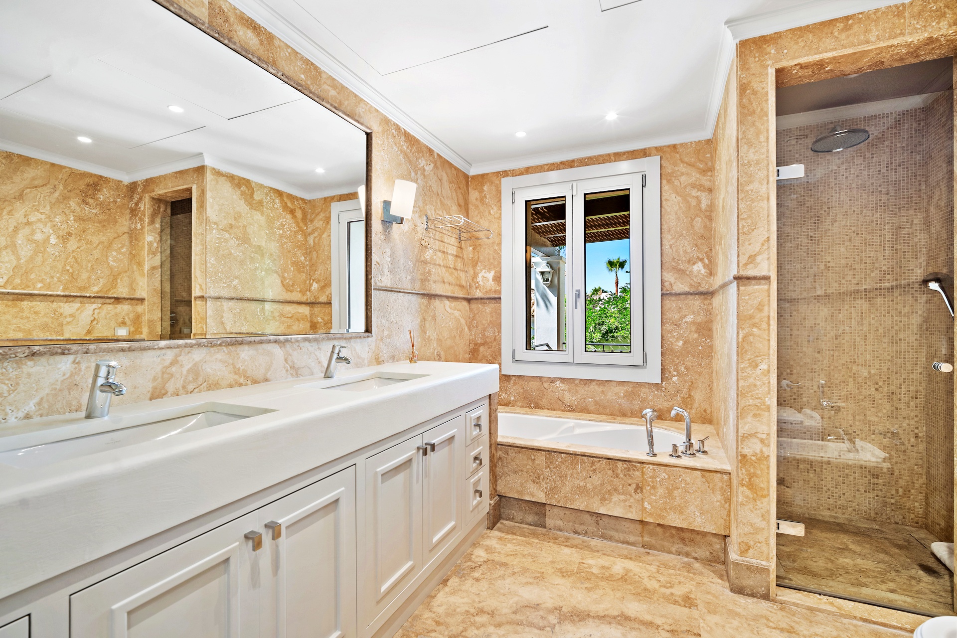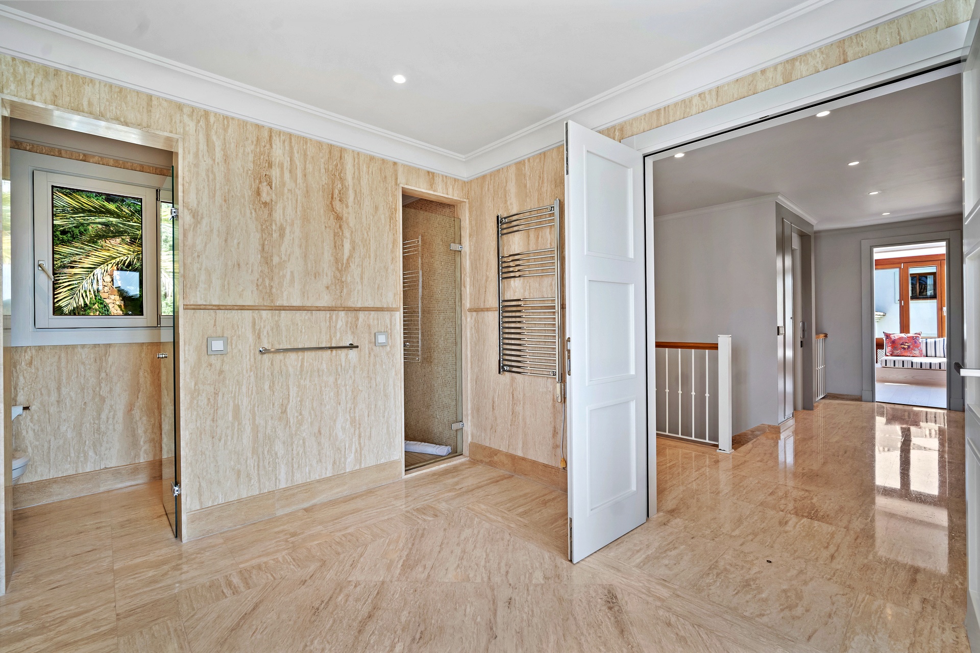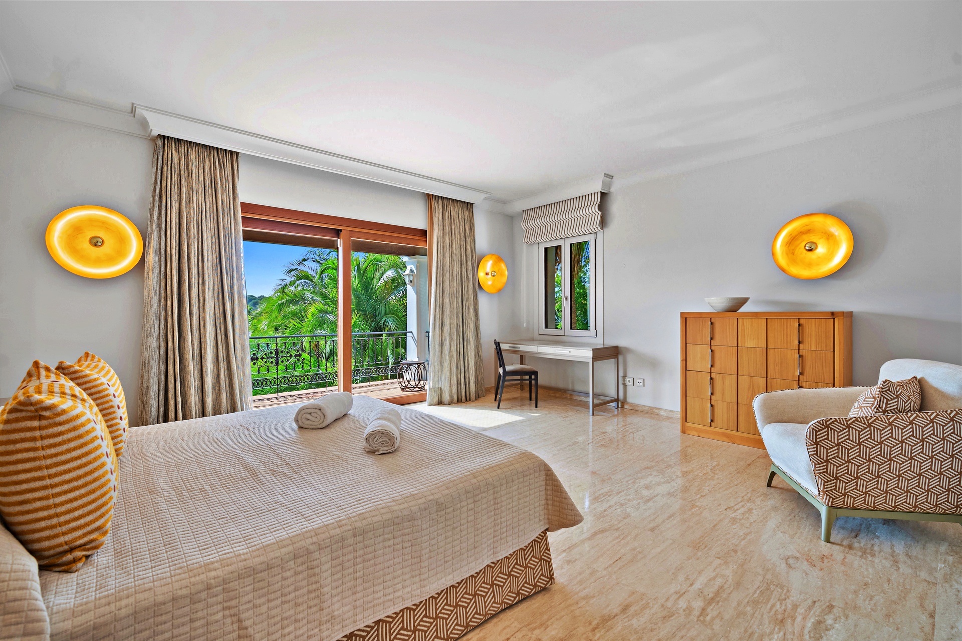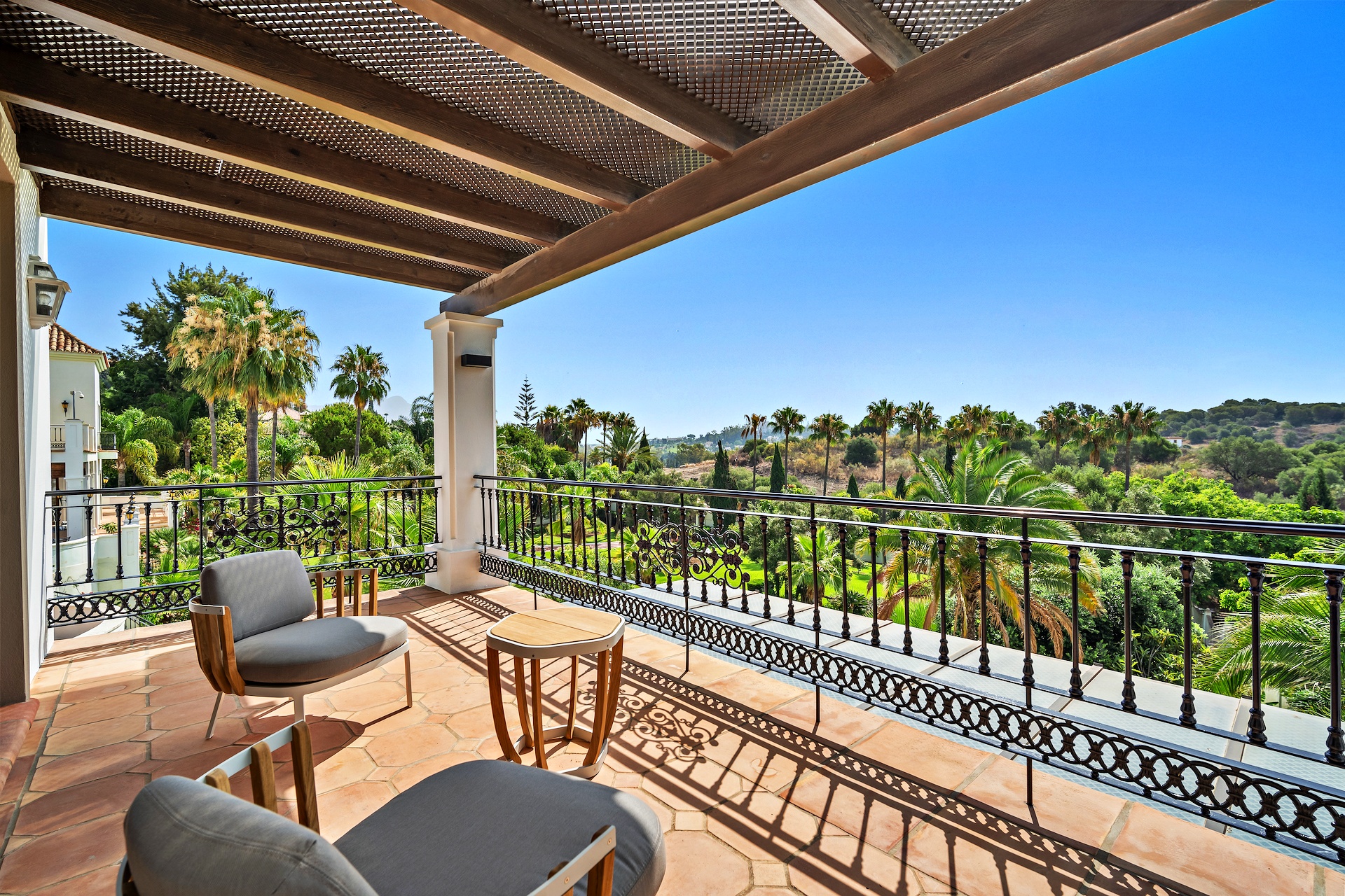 The recently renovated guest house is a three-story villa finished to exceptional standards. Each room features an en-suite bathroom and private terrace or garden access. The master suite impresses with a vaulted ceiling, sitting area, dressing room, and a sumptuous bathroom. The lower level hosts elegant living and dining rooms, a spa room, and a newly fitted kitchen with premium built-in appliances. A spacious terrace offers breathtaking panoramic views, while direct access to the shared pool enhances the sense of connection between both residences.