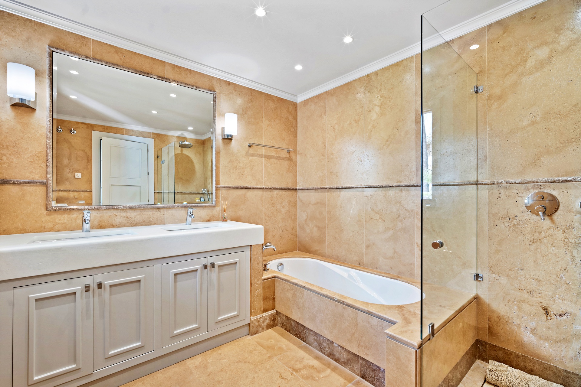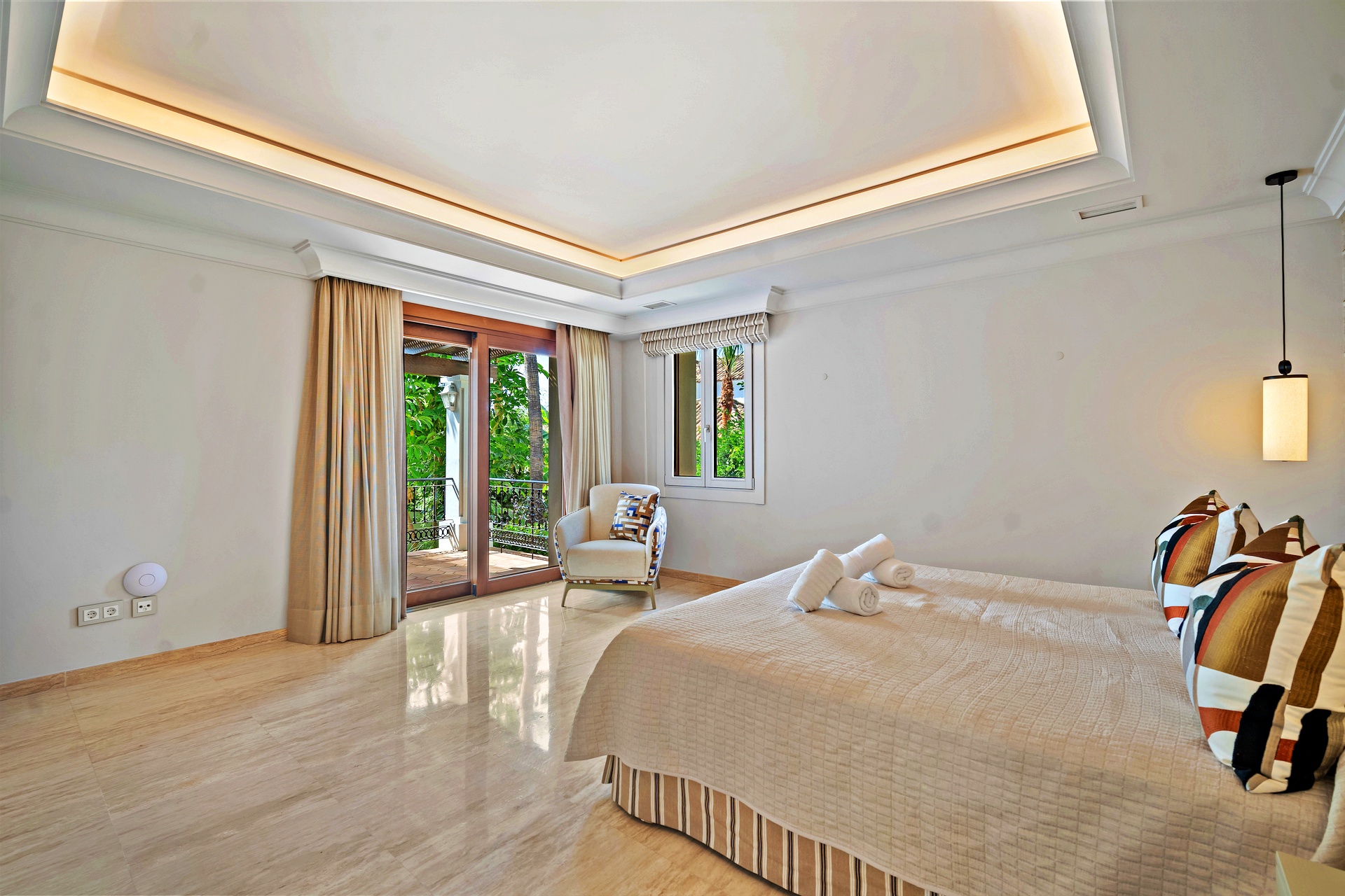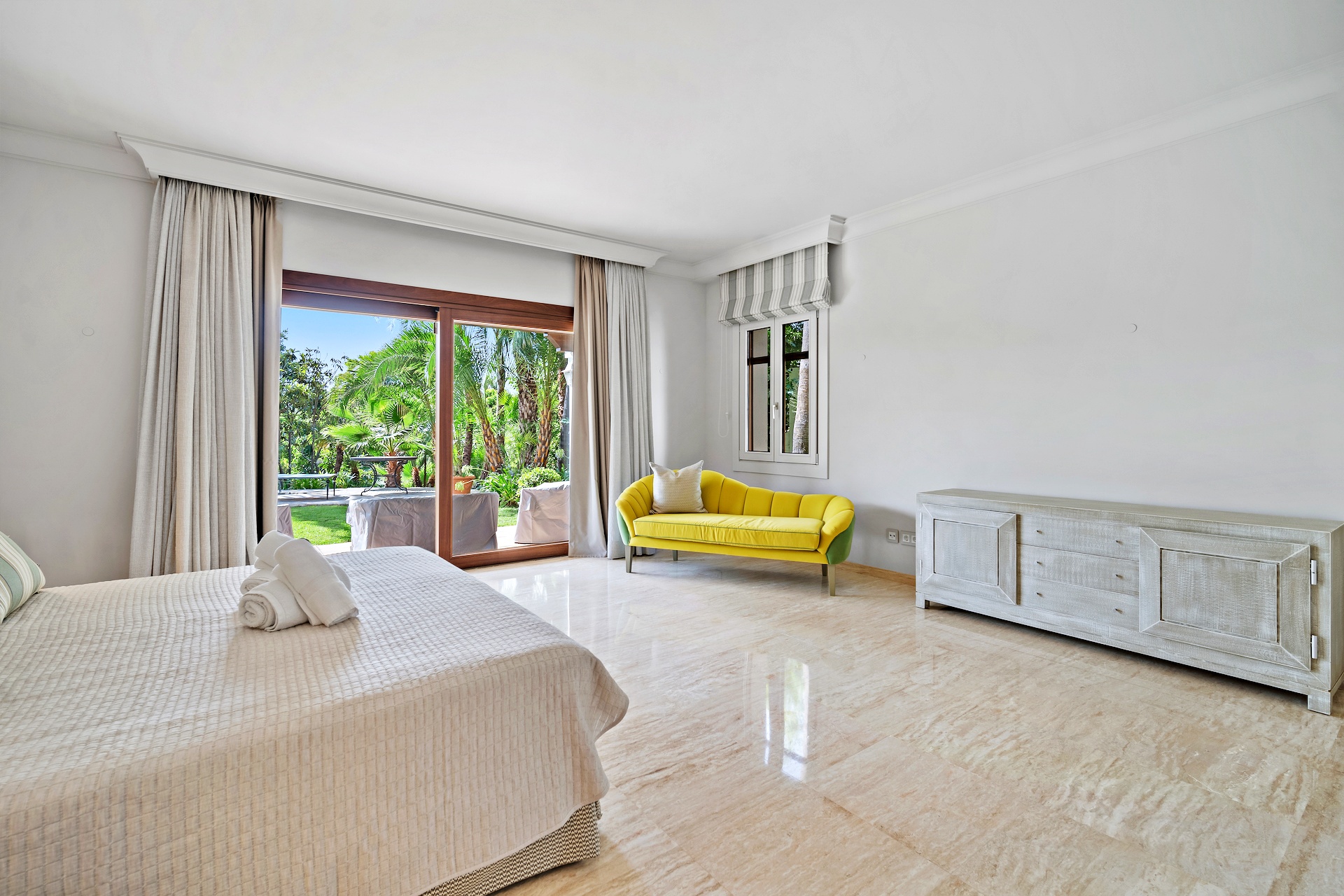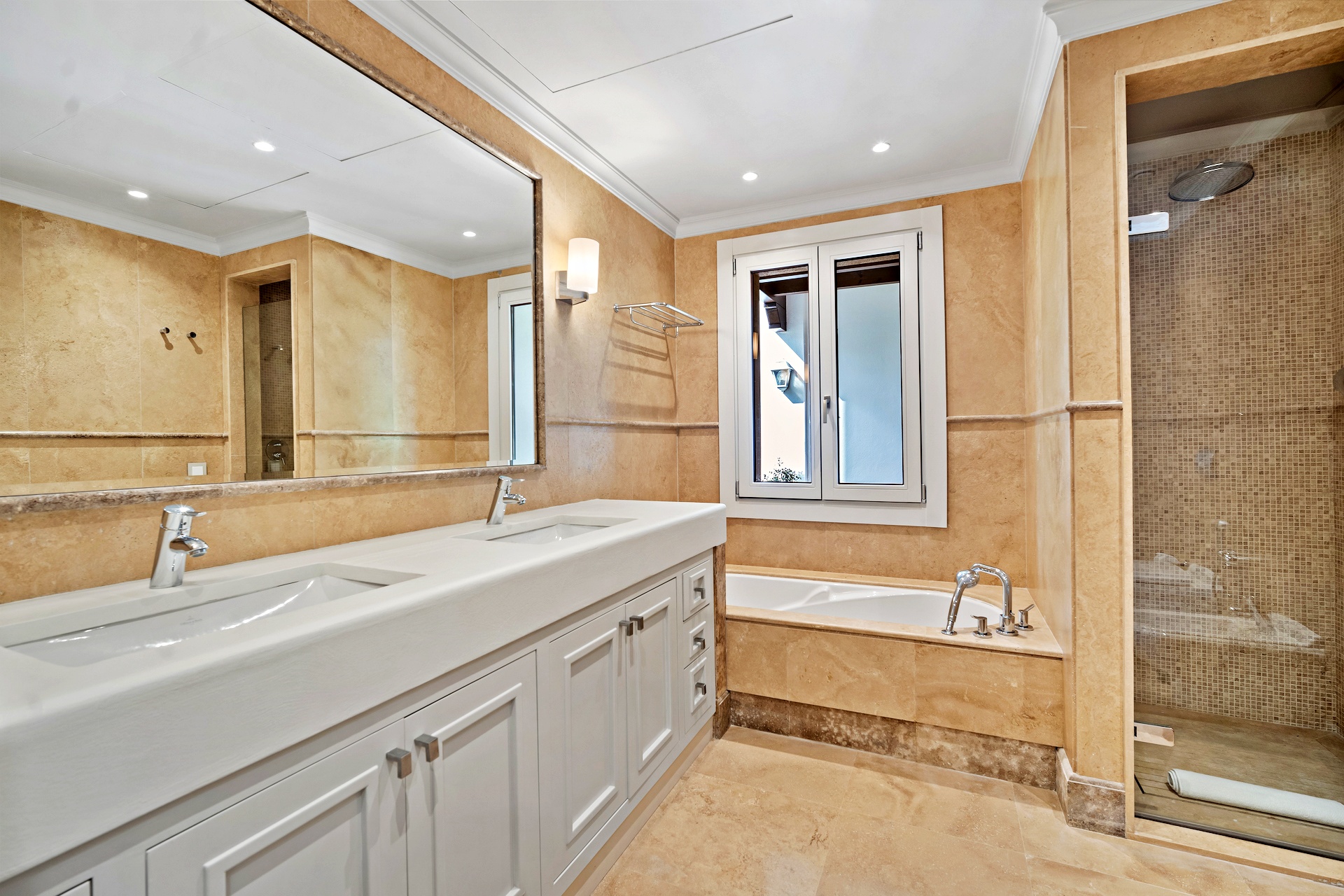 The recently renovated guest house is a three-story villa finished to exceptional standards. Each room features an en-suite bathroom and private terrace or garden access. The master suite impresses with a vaulted ceiling, sitting area, dressing room, and a sumptuous bathroom. The lower level hosts elegant living and dining rooms, a spa room, and a newly fitted kitchen with premium built-in appliances. A spacious terrace offers breathtaking panoramic views, while direct access to the shared pool enhances the sense of connection between both residences.