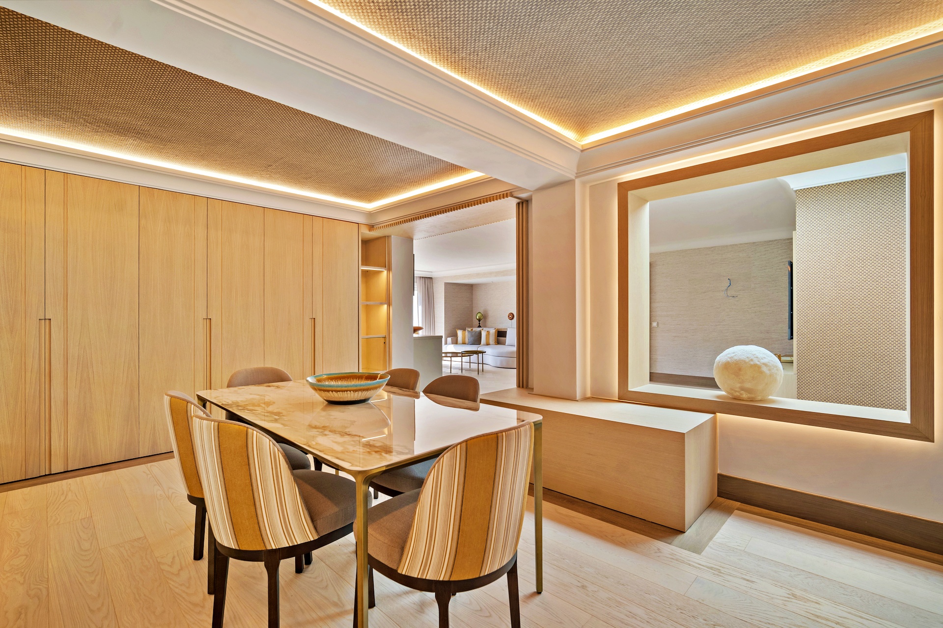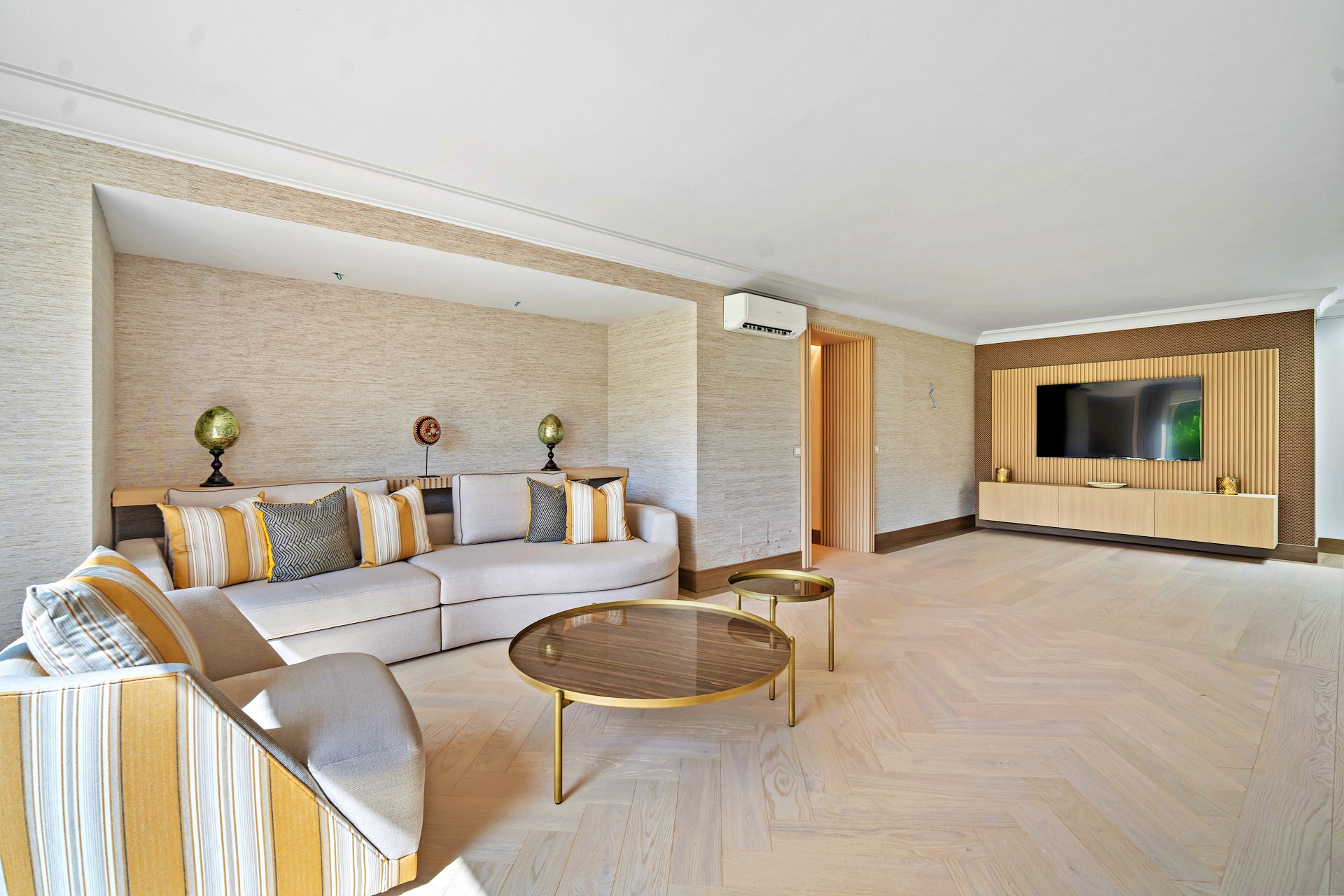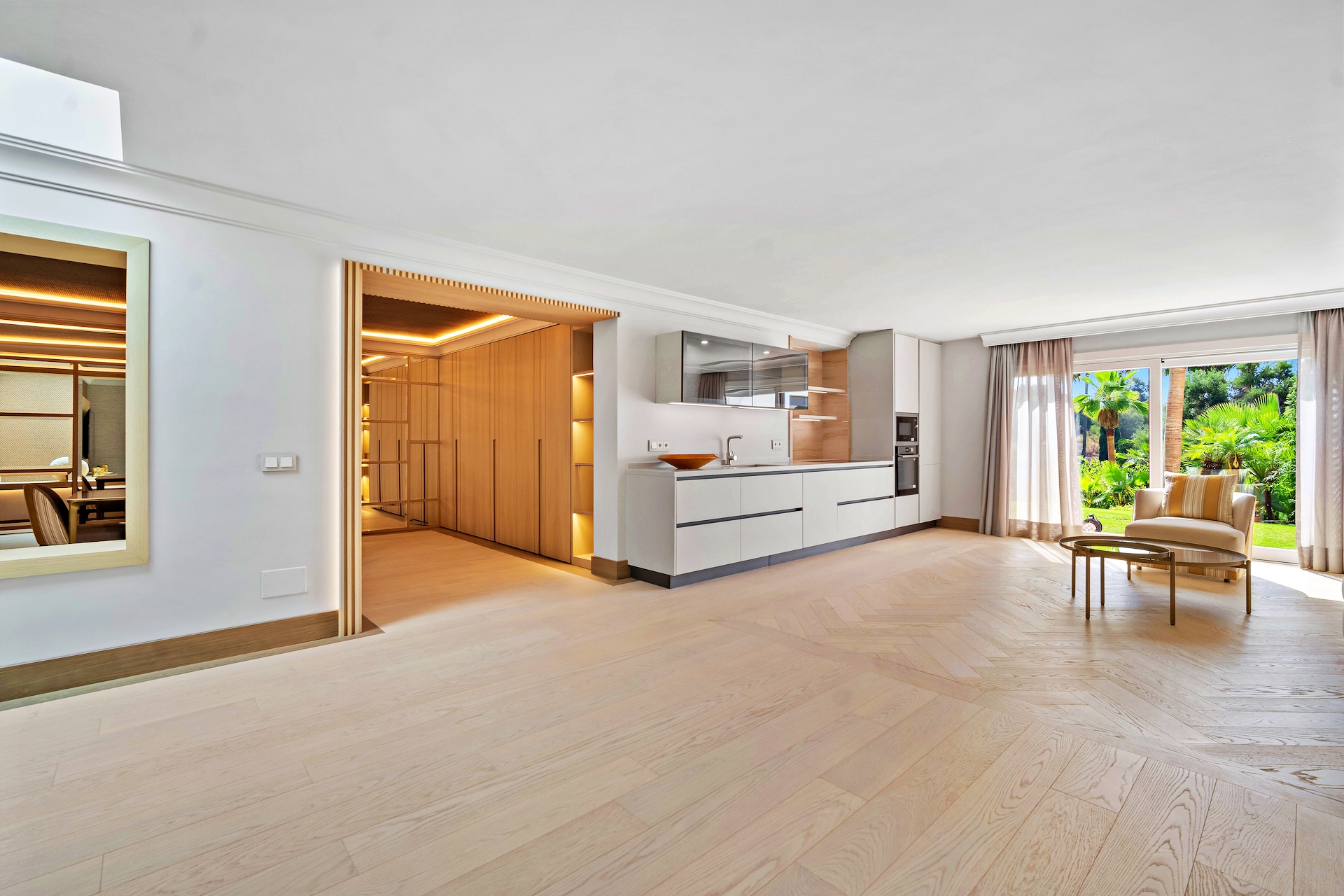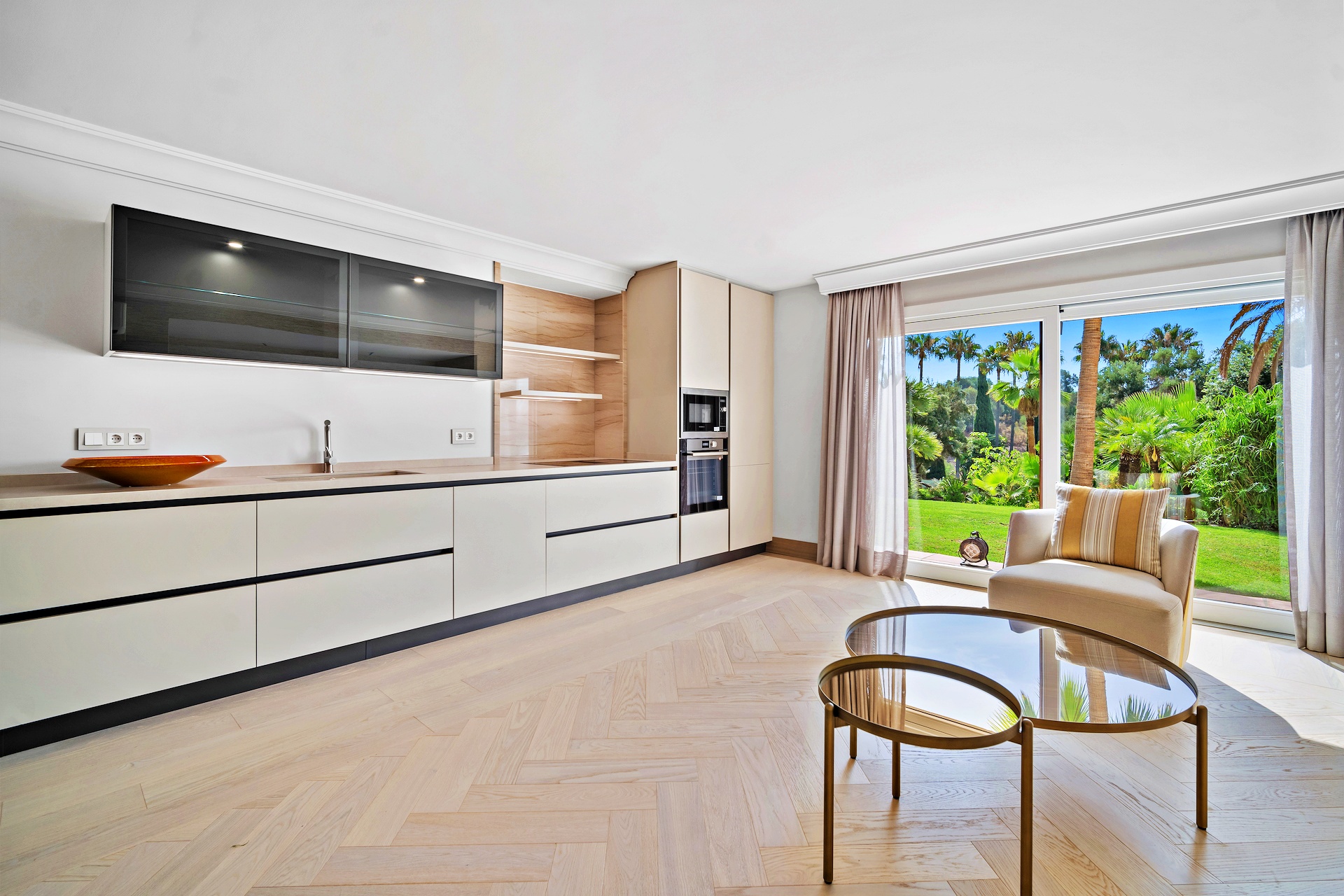 Open-plan living, dining, and bar area leading to large terraces and pool