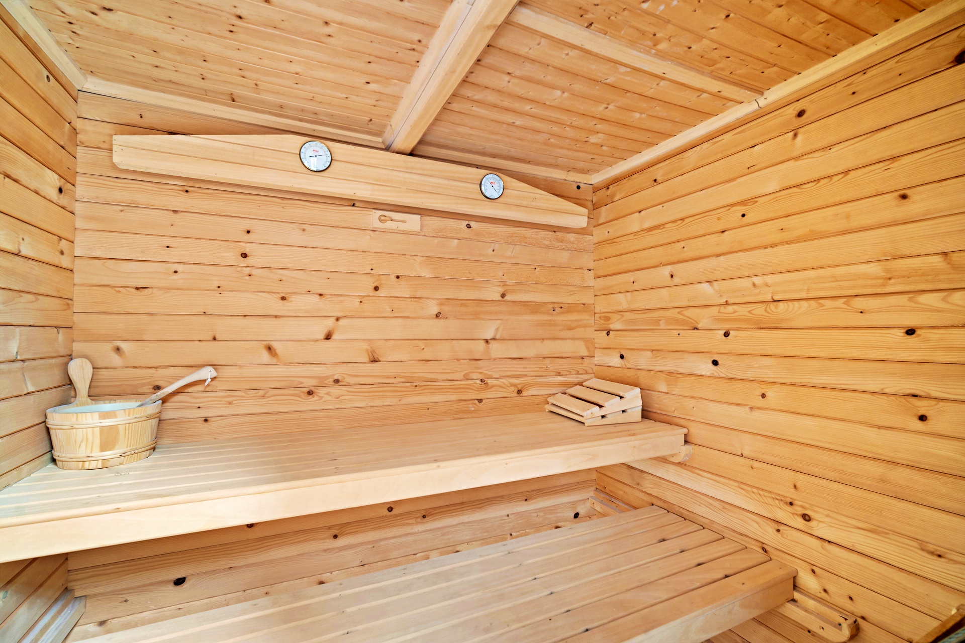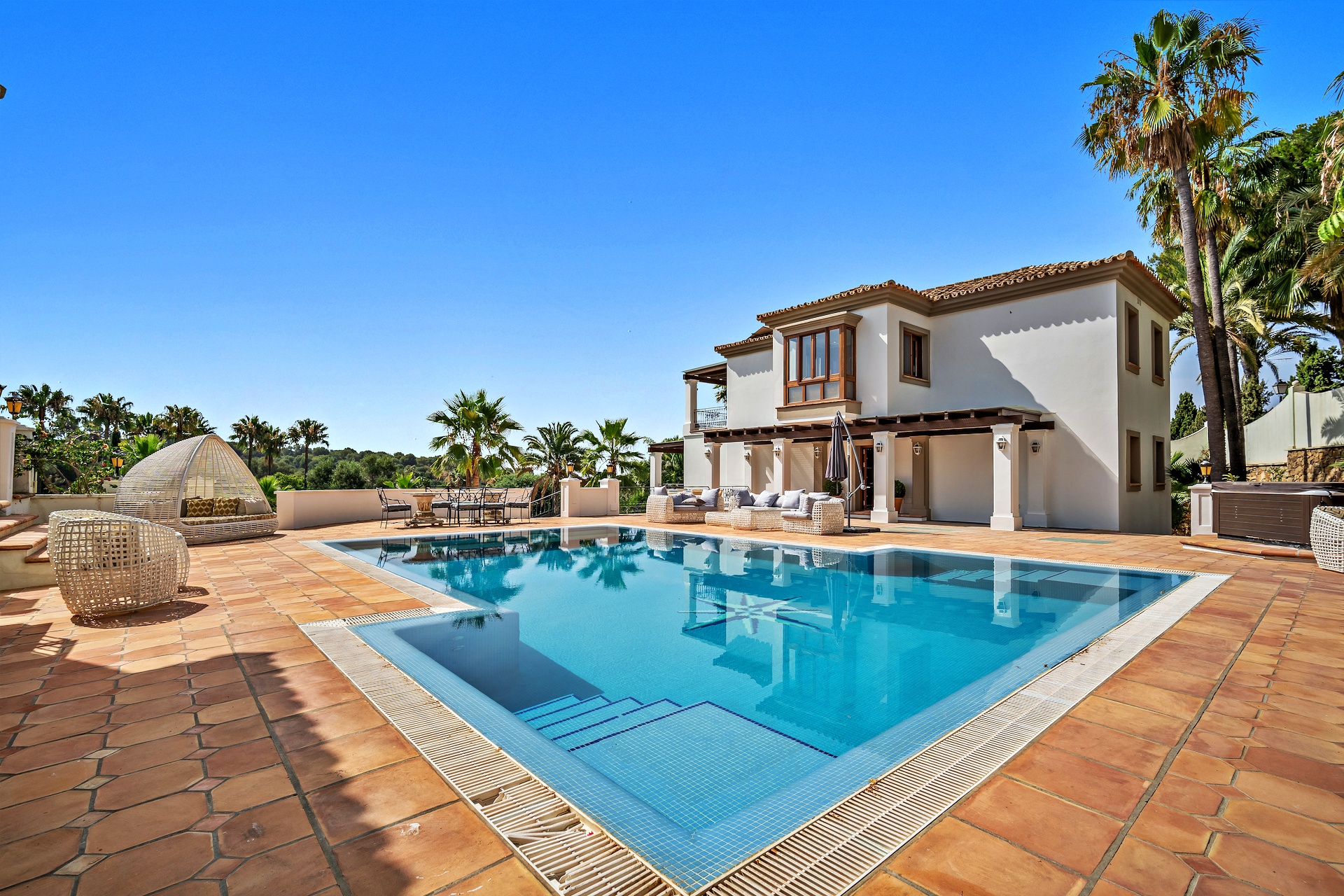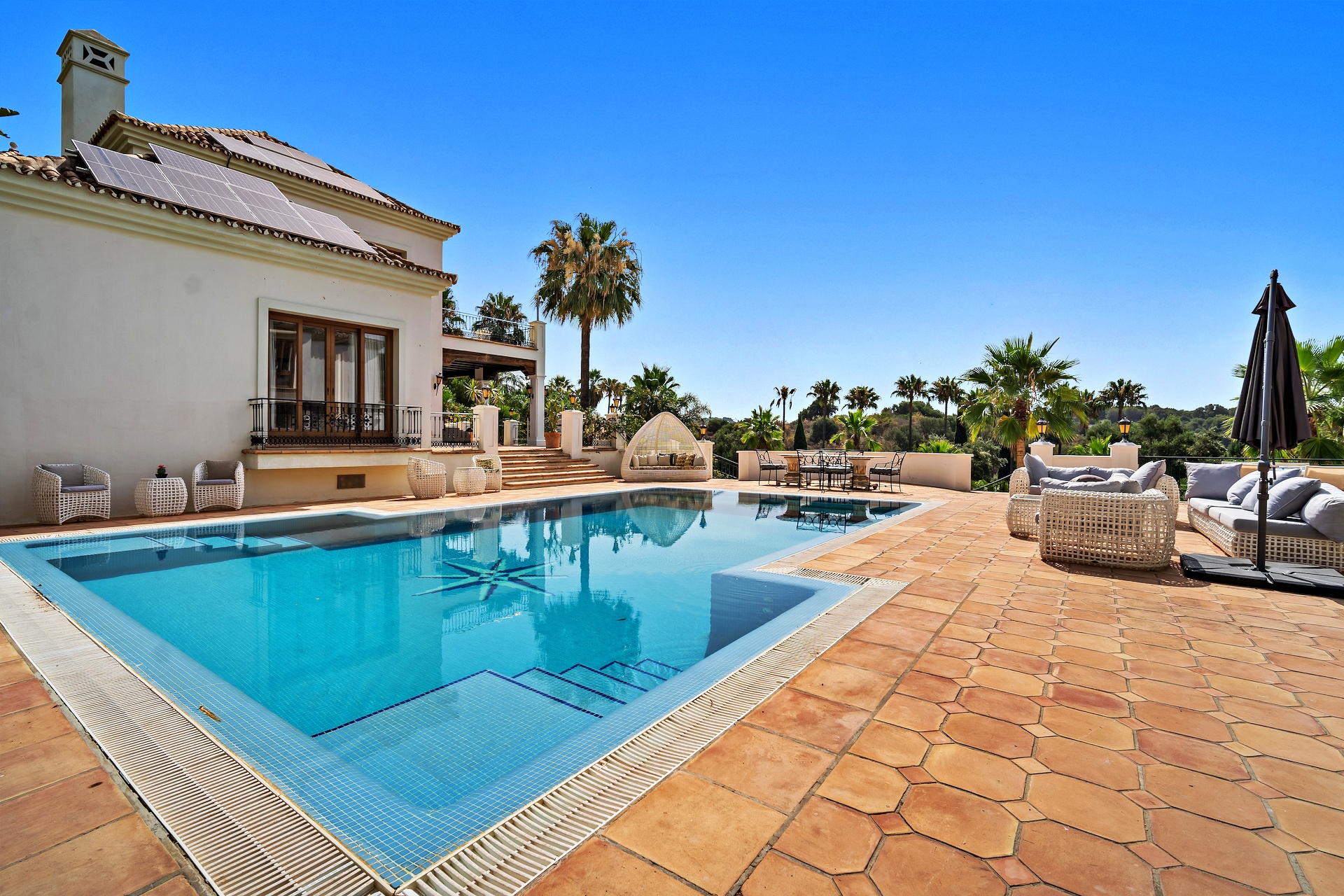 Large private swimming pool, sun deck, and multiple outdoor terraces