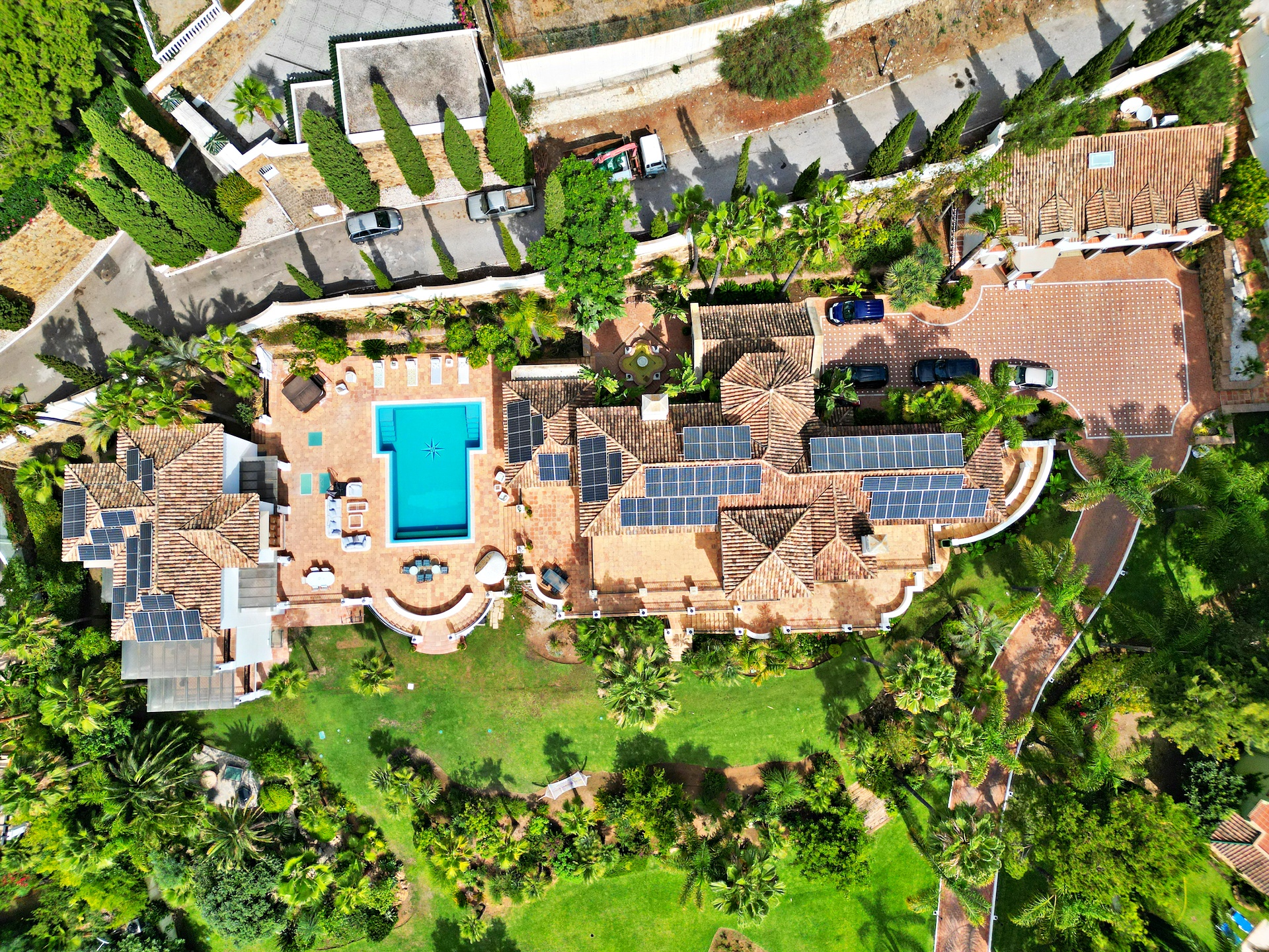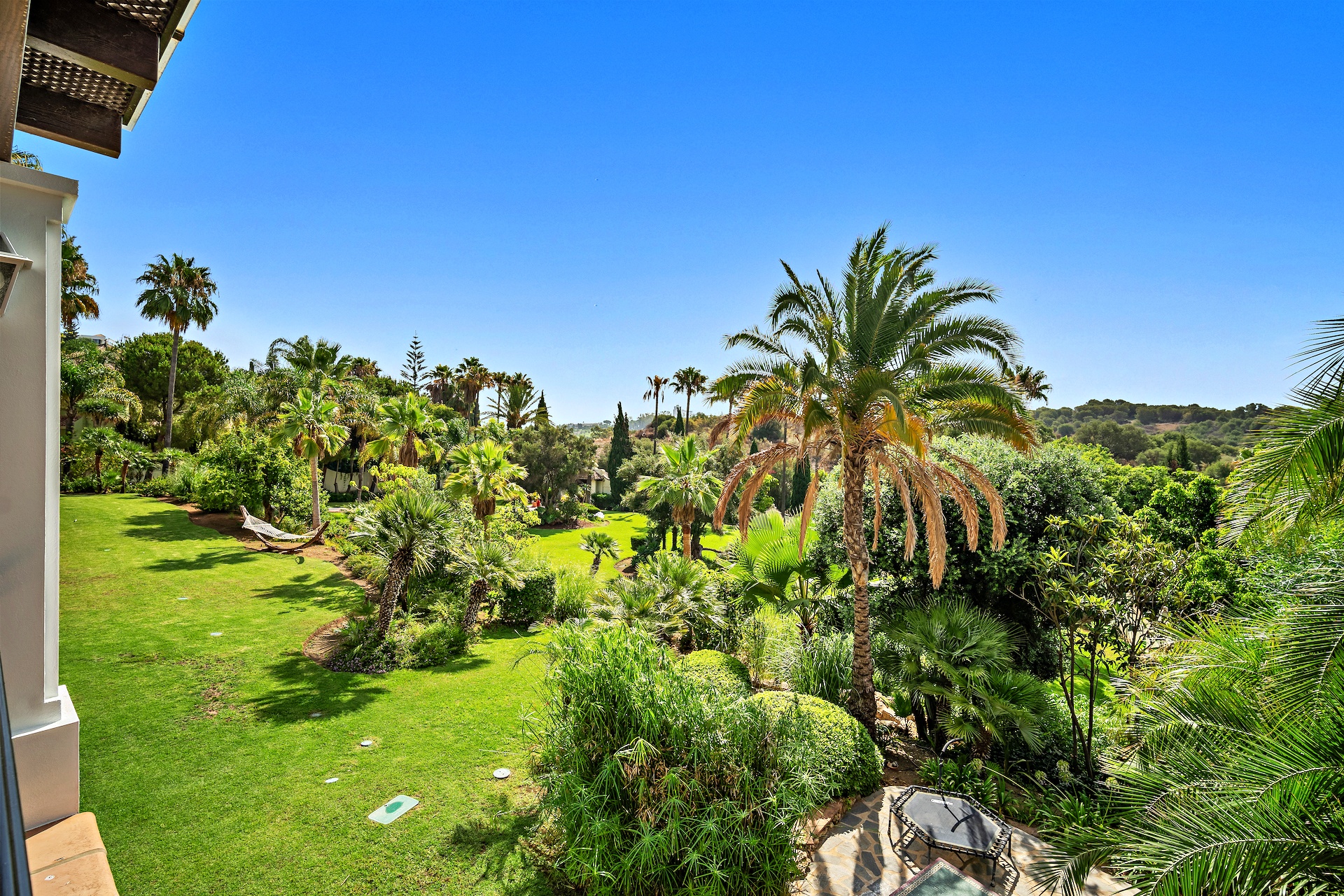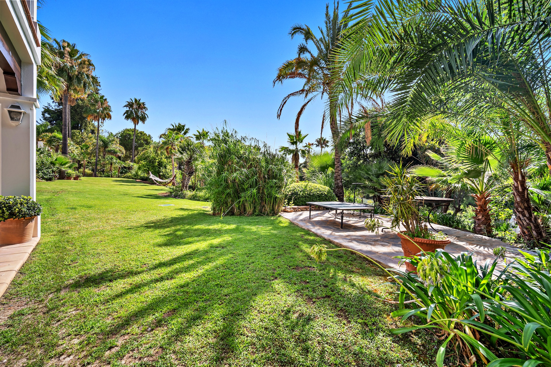 Surrounded by lush, mature tropical gardens and expansive lawns, Rancho Paraiso offers a tranquil oasis with a large private swimming pool, sun deck, and multiple terraces for outdoor living. The property also includes a private garage for three cars and ample driveway parking.