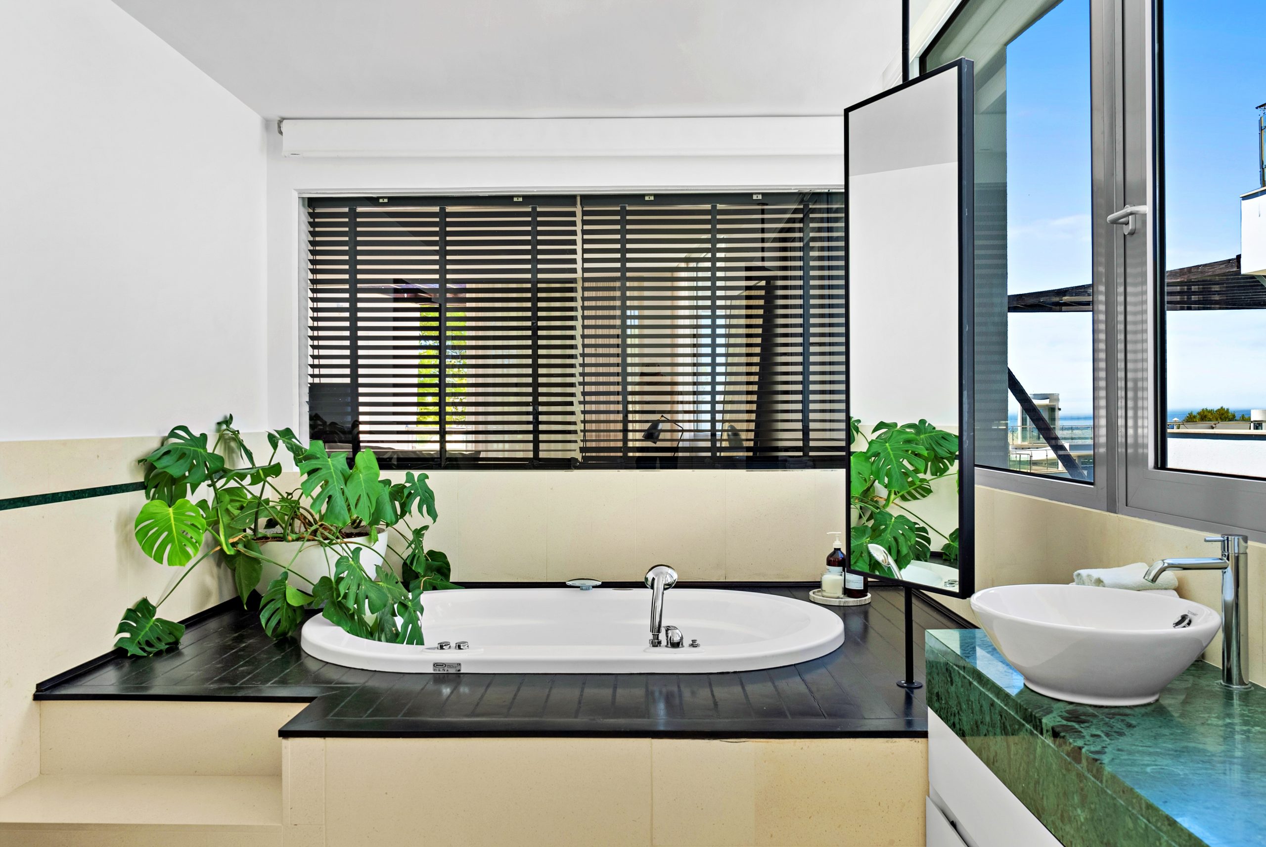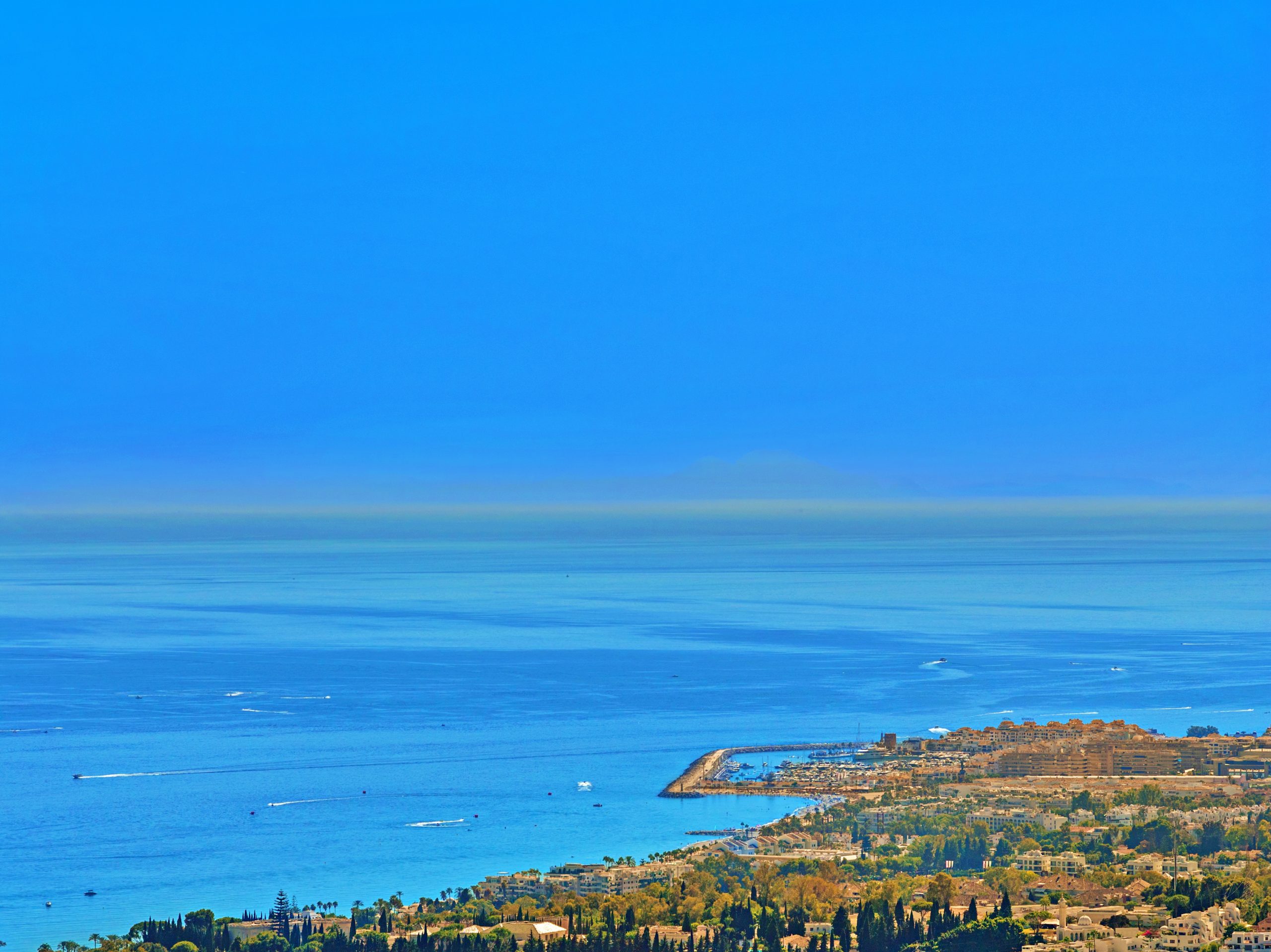 This elegant home offers breathtaking views of the Mediterranean coast.