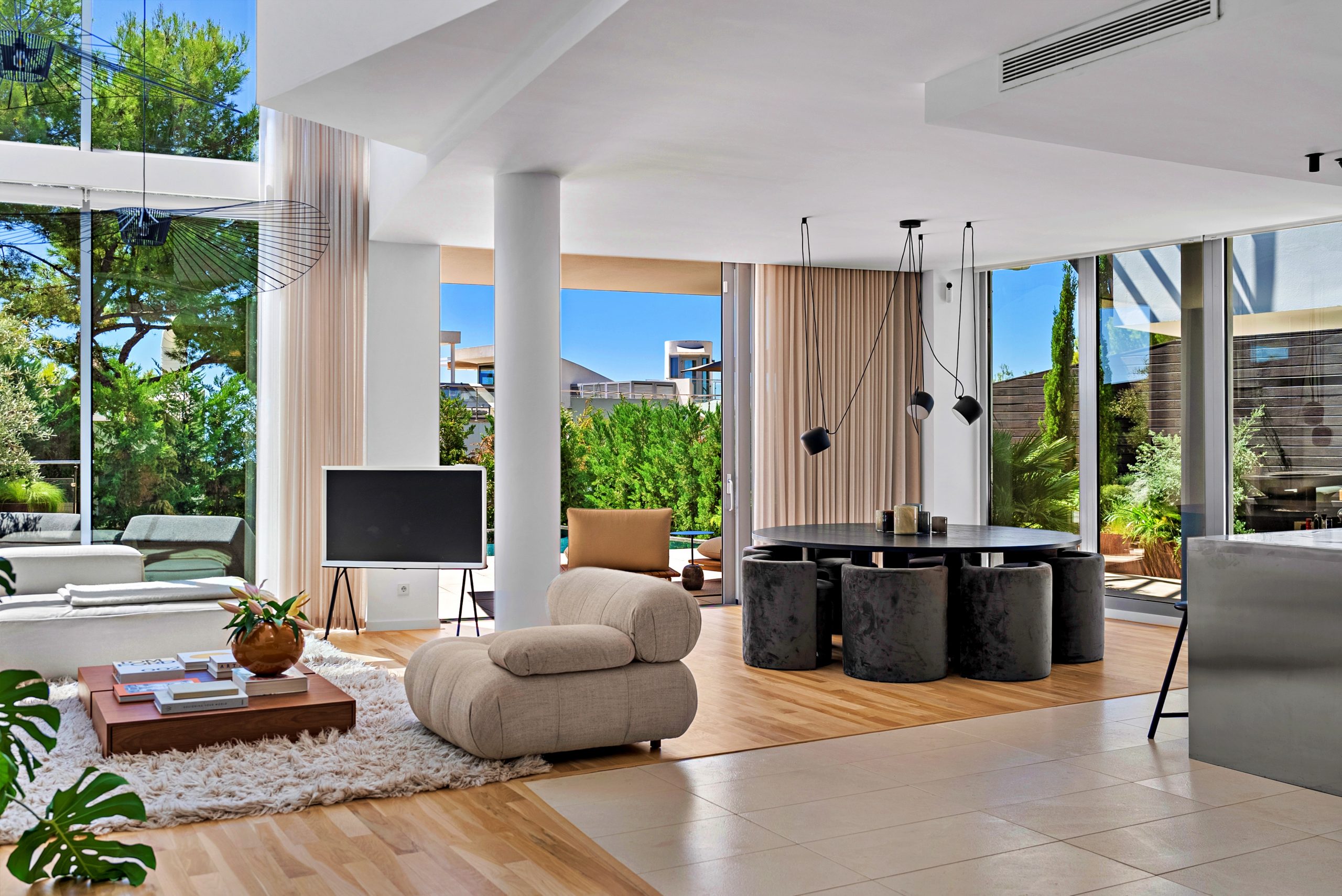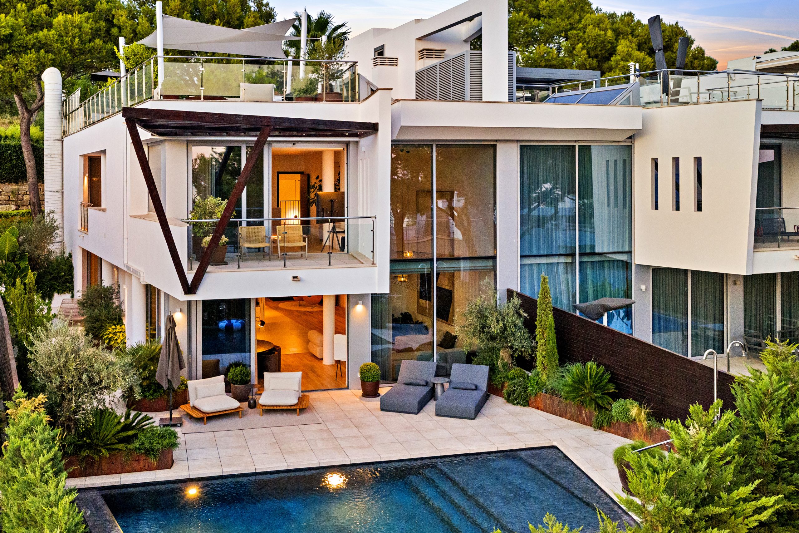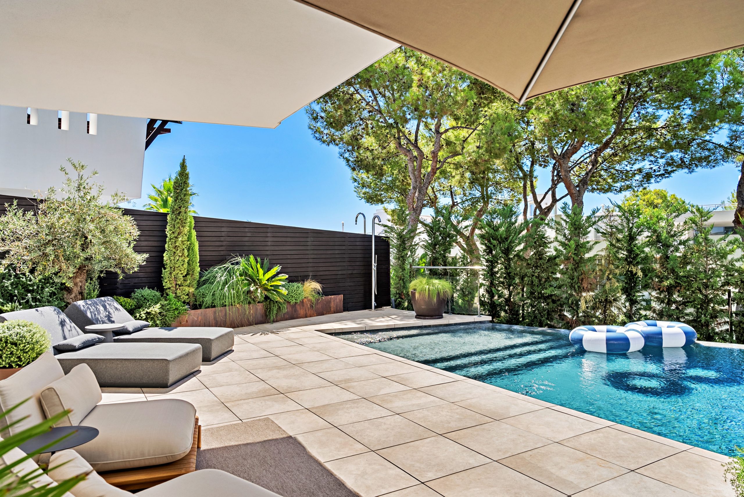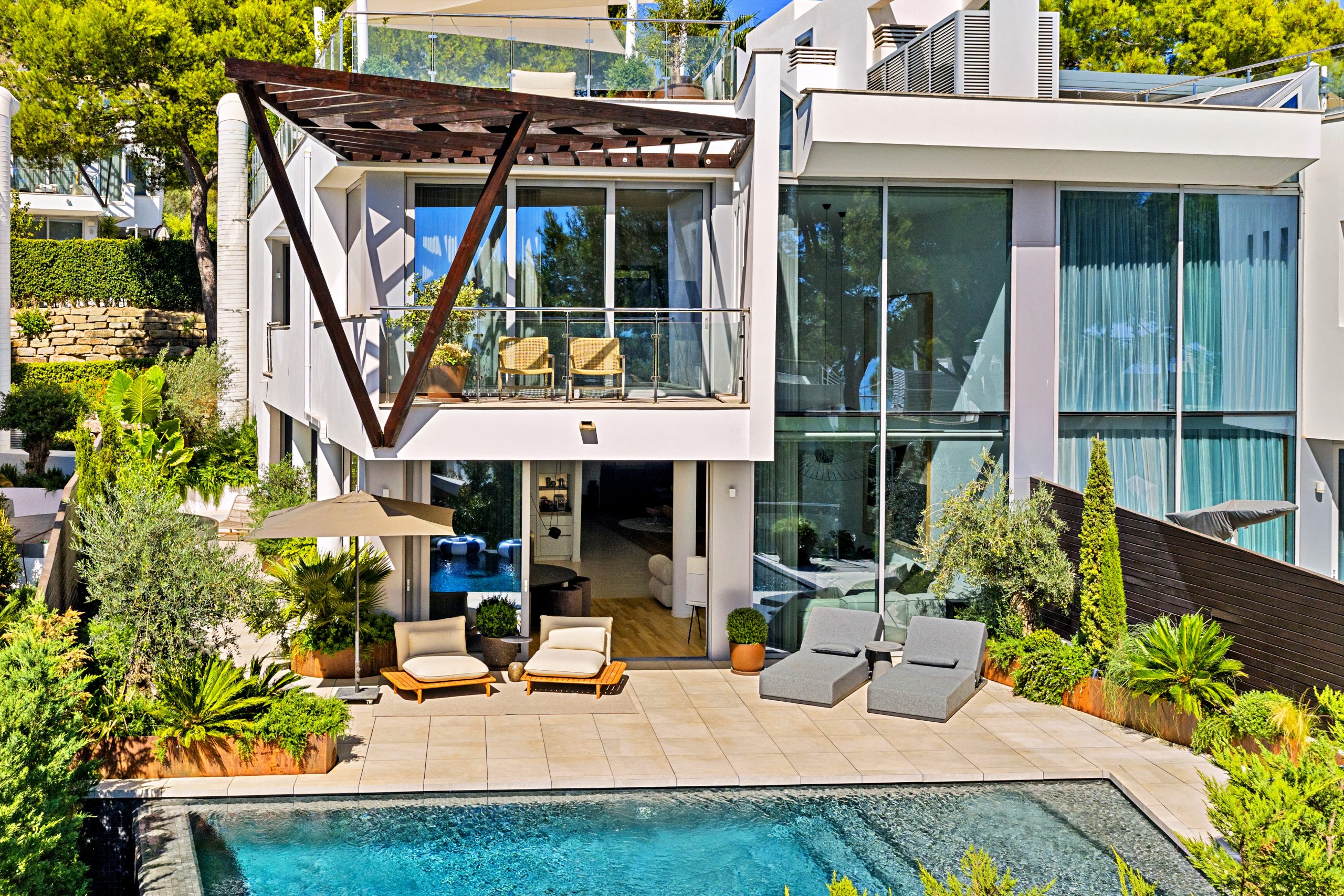 The bright living space is spread over two levels and includes large outdoor areas, a spacious south-facing terrace with a private pool and unique design elements.