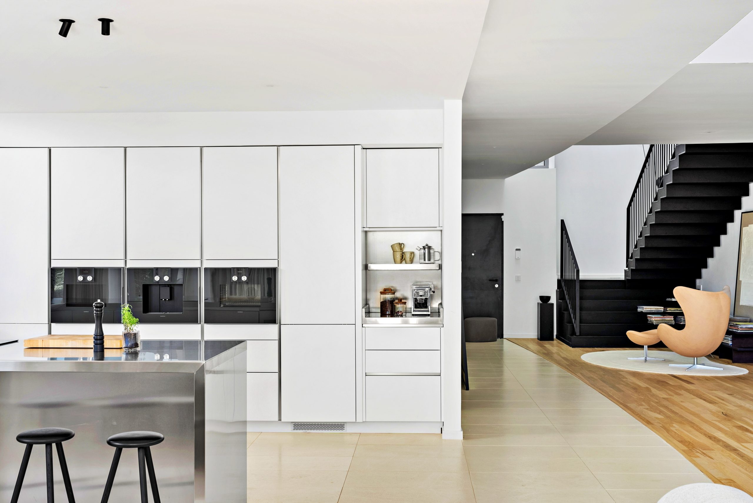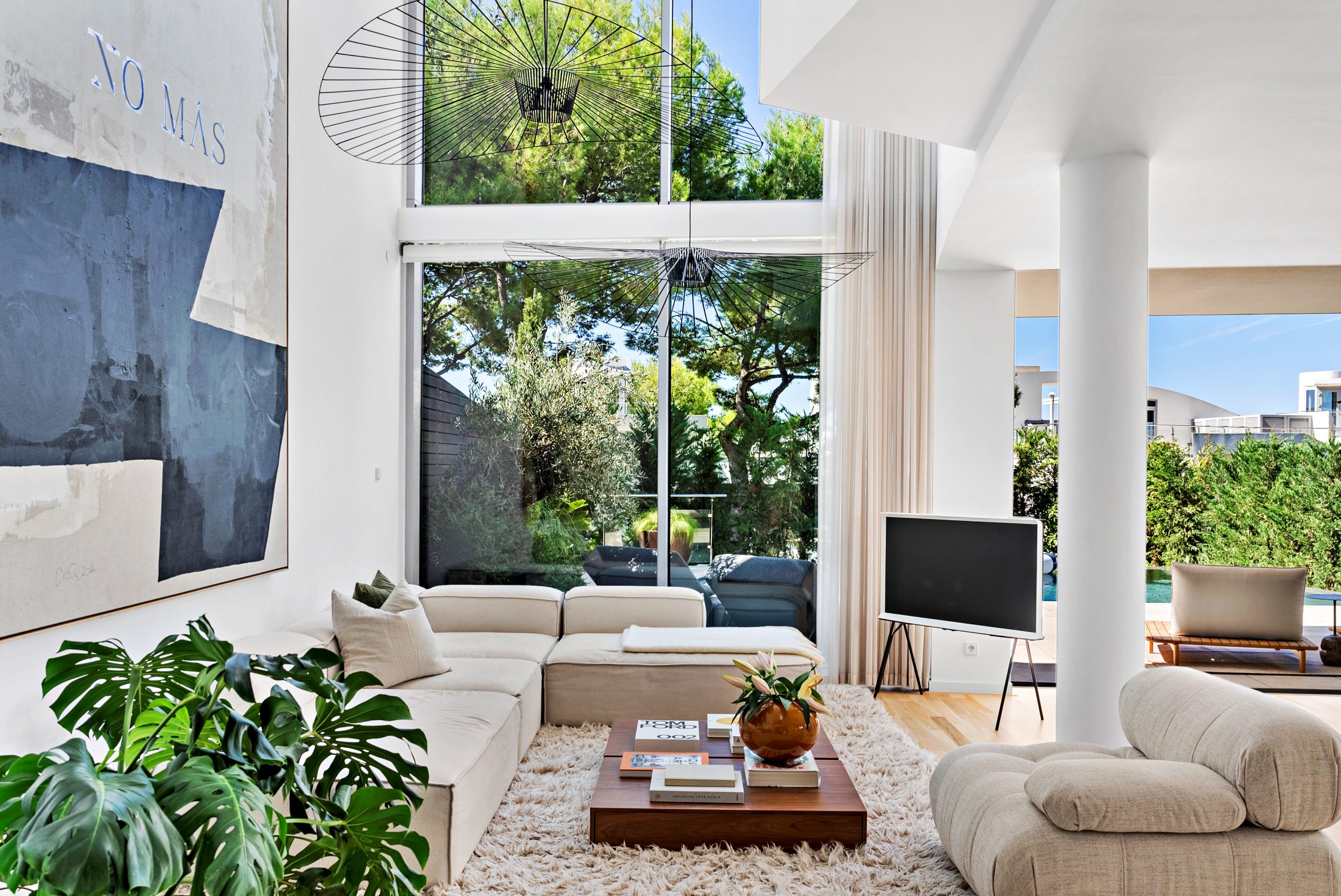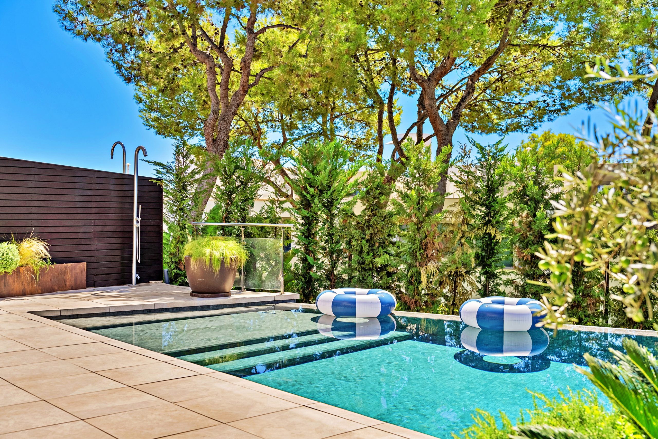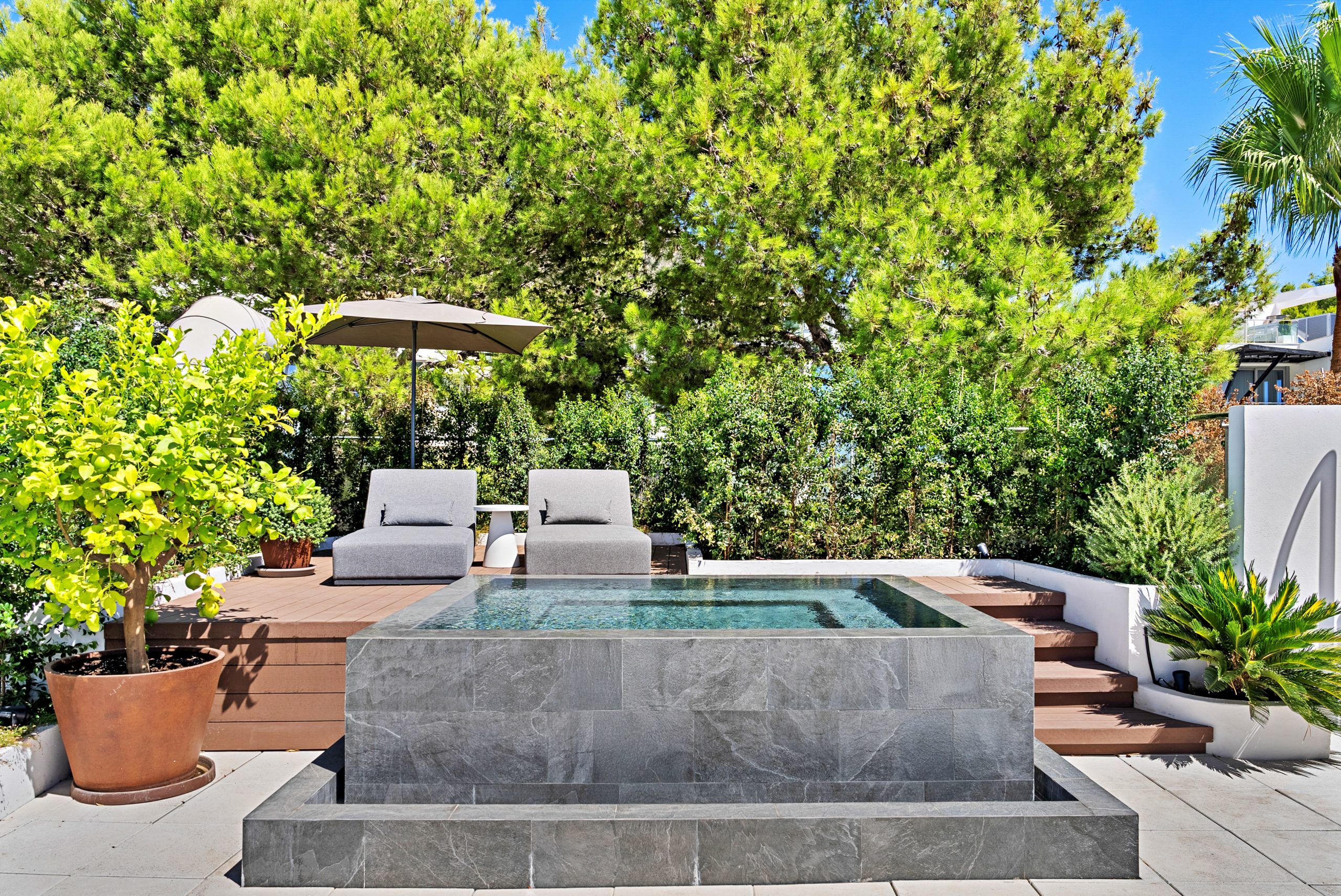 The bright living space is spread over two levels and includes large outdoor areas, a spacious south-facing terrace with a private pool and unique design elements.