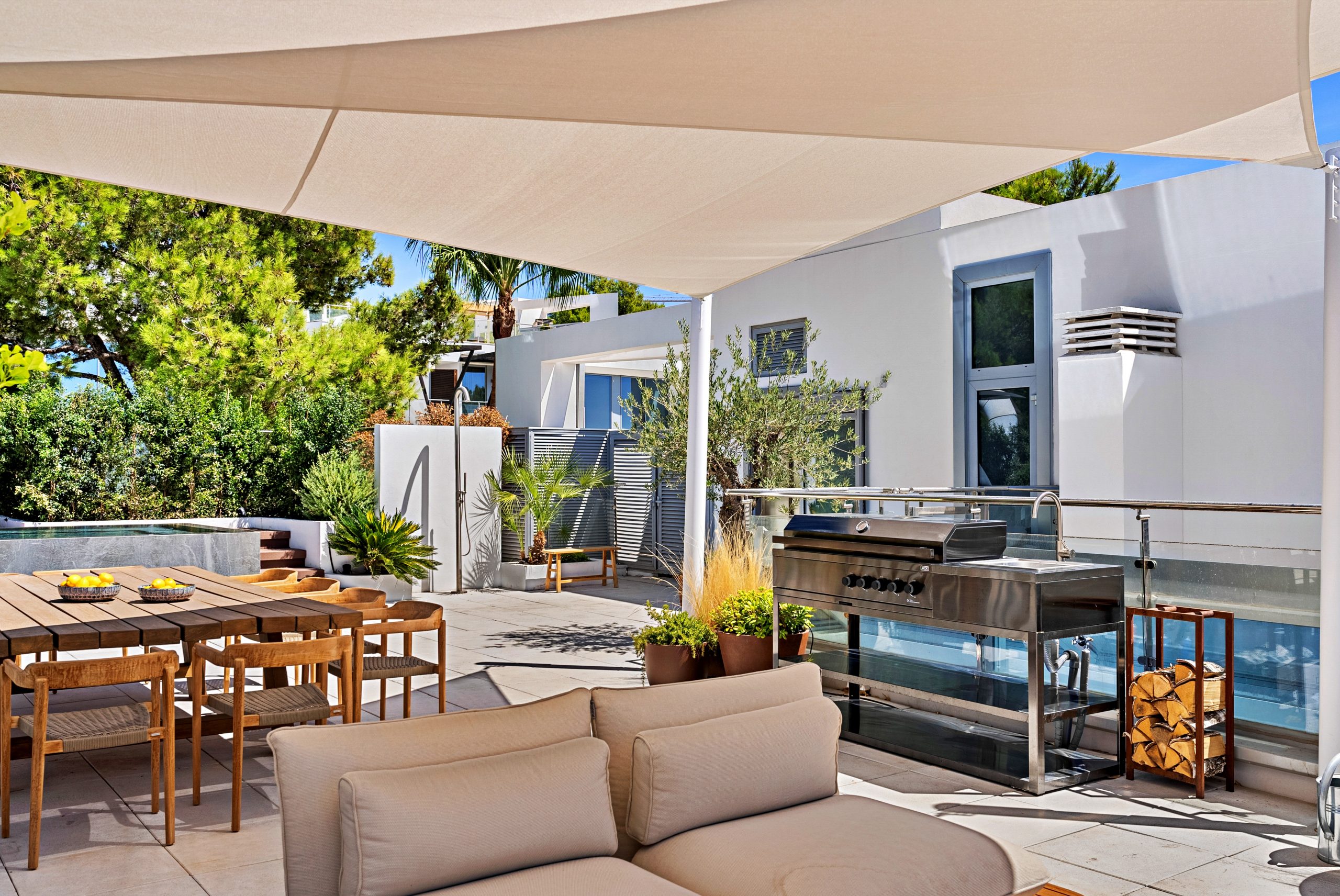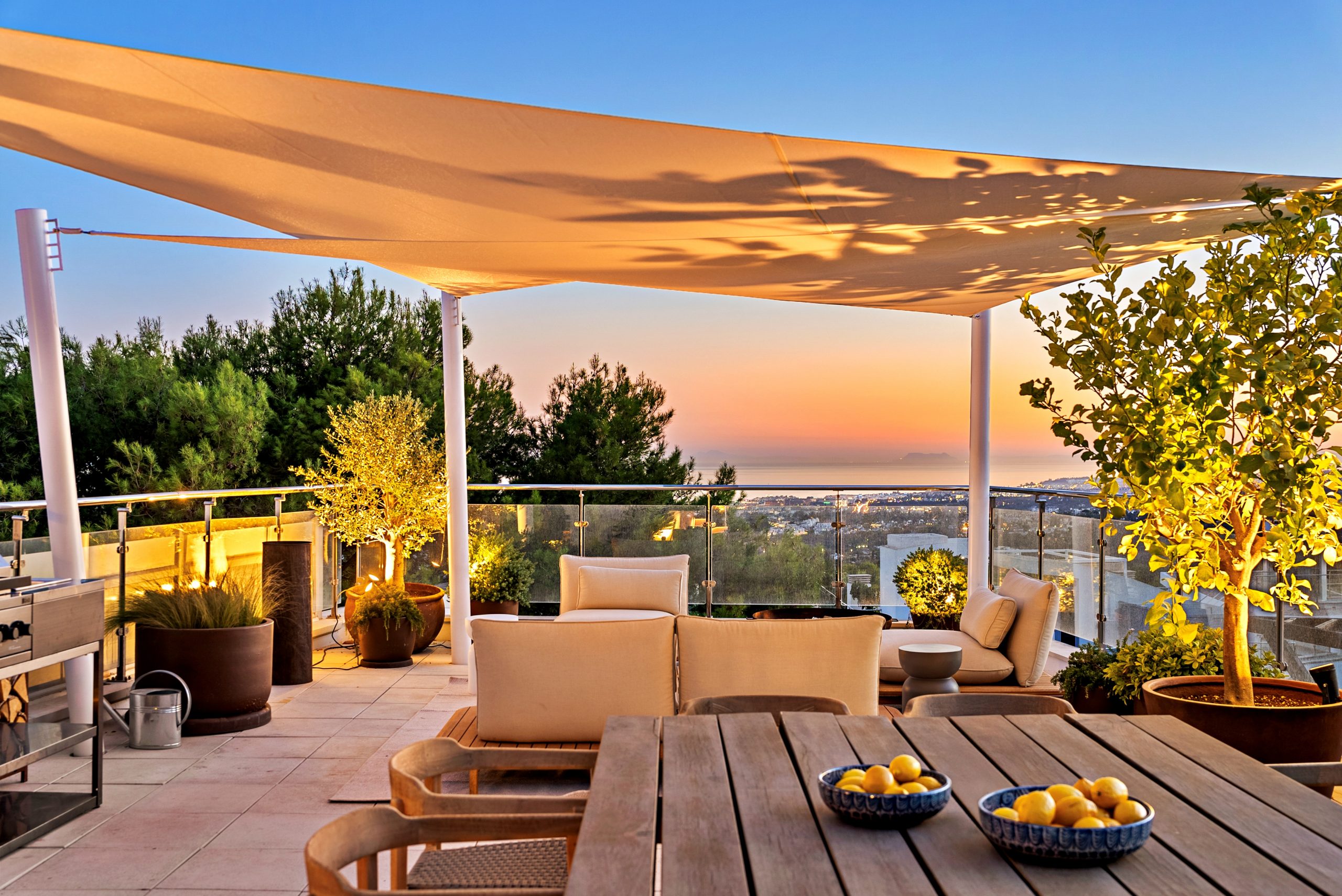 From your private rooftop terrace, enjoy sunsets with stunning coastal views, a summer kitchen, and a Jacuzzi for relaxing. The lower level features a private golf simulator, easily converted into a cinema or games room, and a three-car garage with additional storage.
