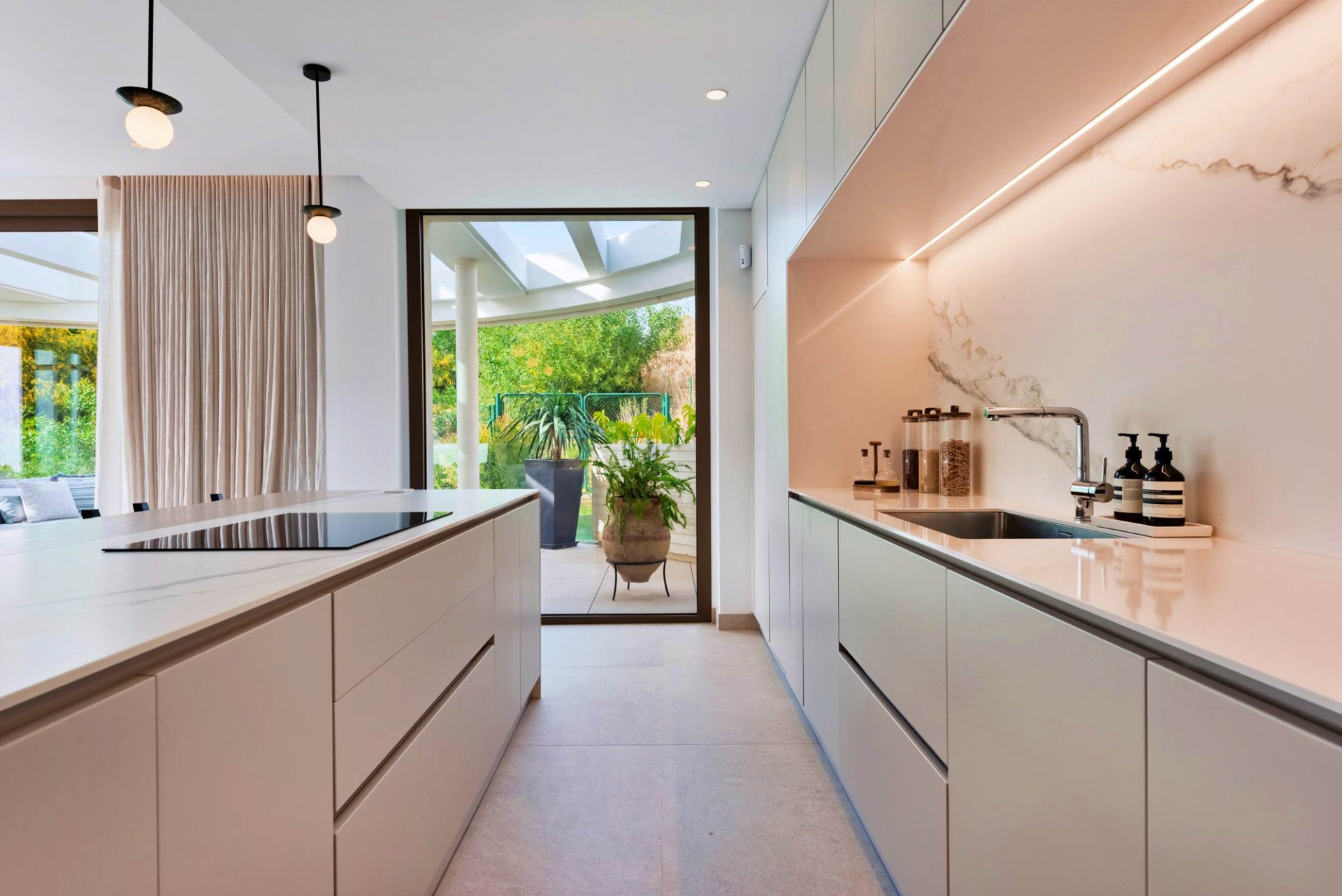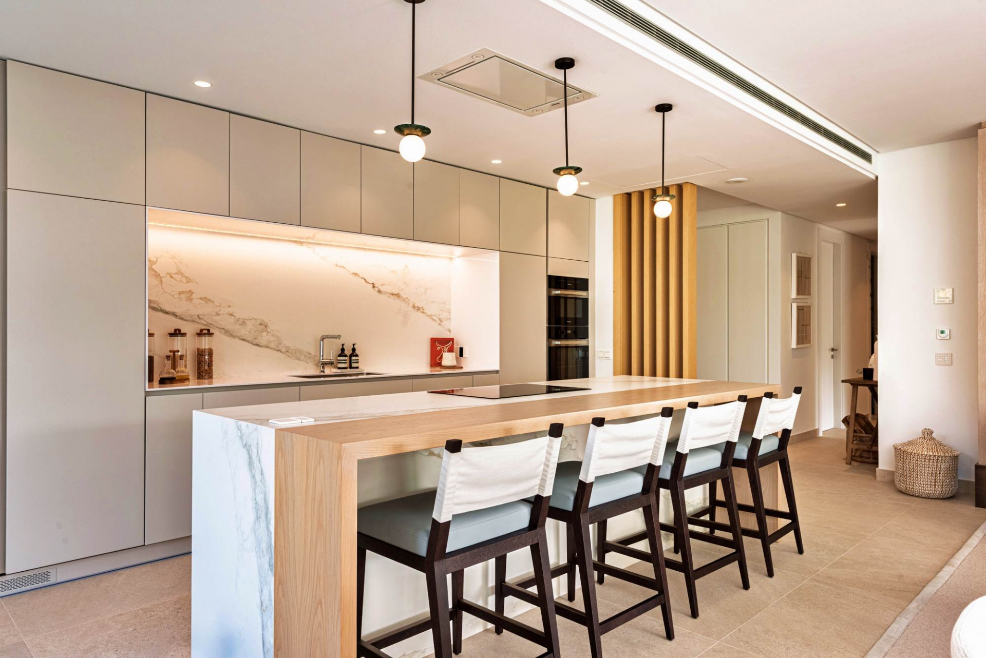 Den välutrustade öppna planen köket strömmar sömlöst in i levande och matplatser, som alla översvämmas med naturligt ljus tack vare golv till tak fönster, vilket ger en ljus och luftig atmosfär.