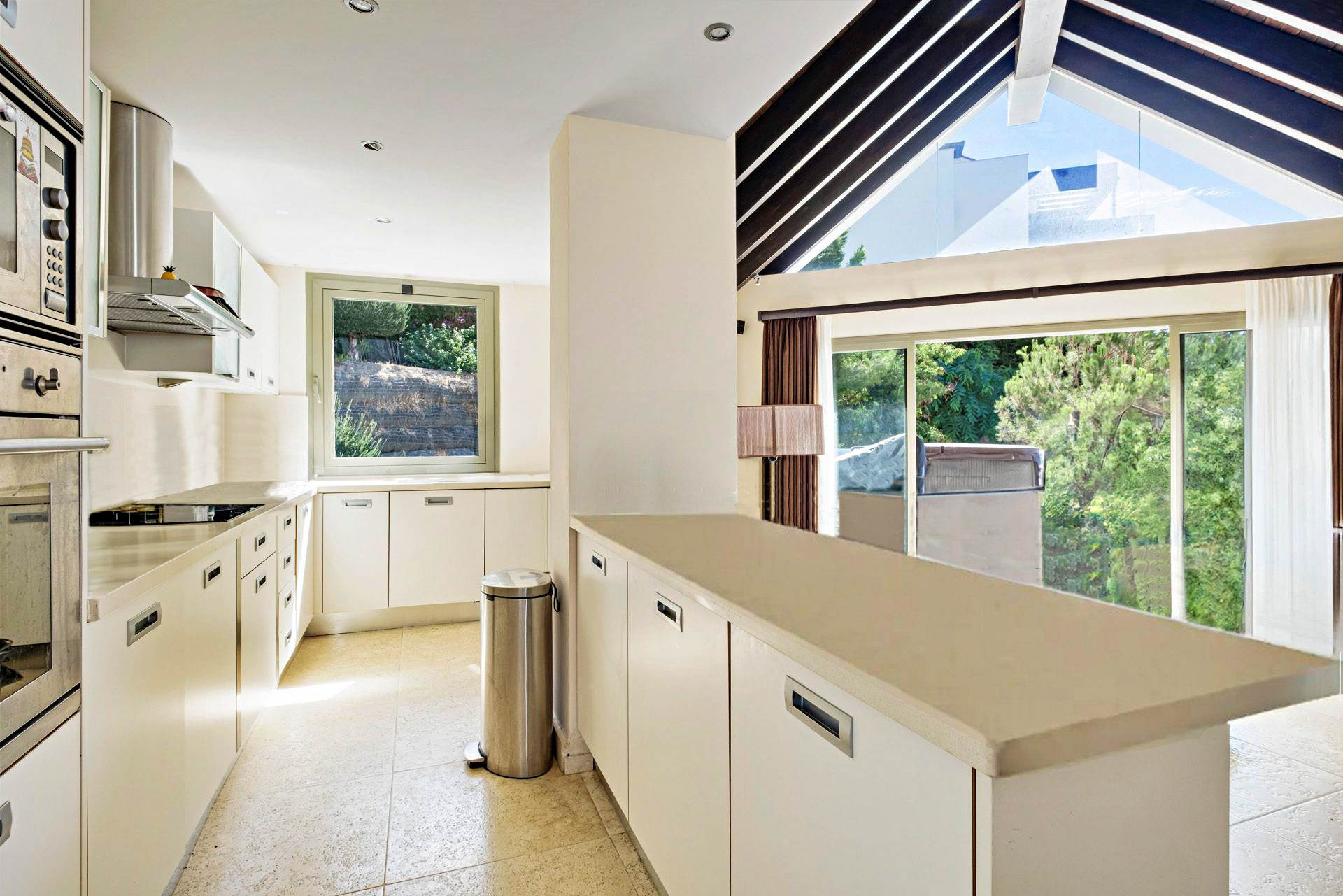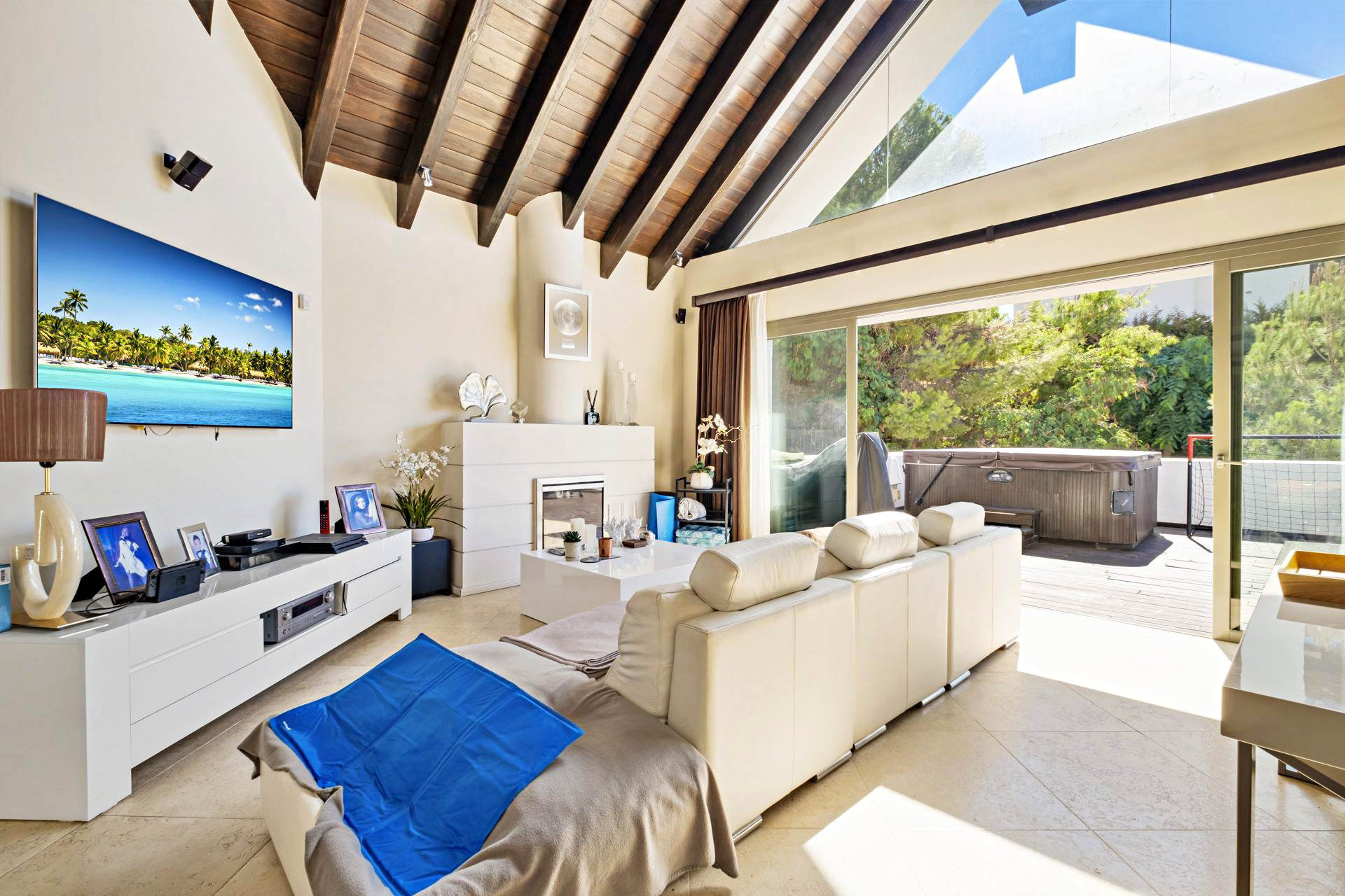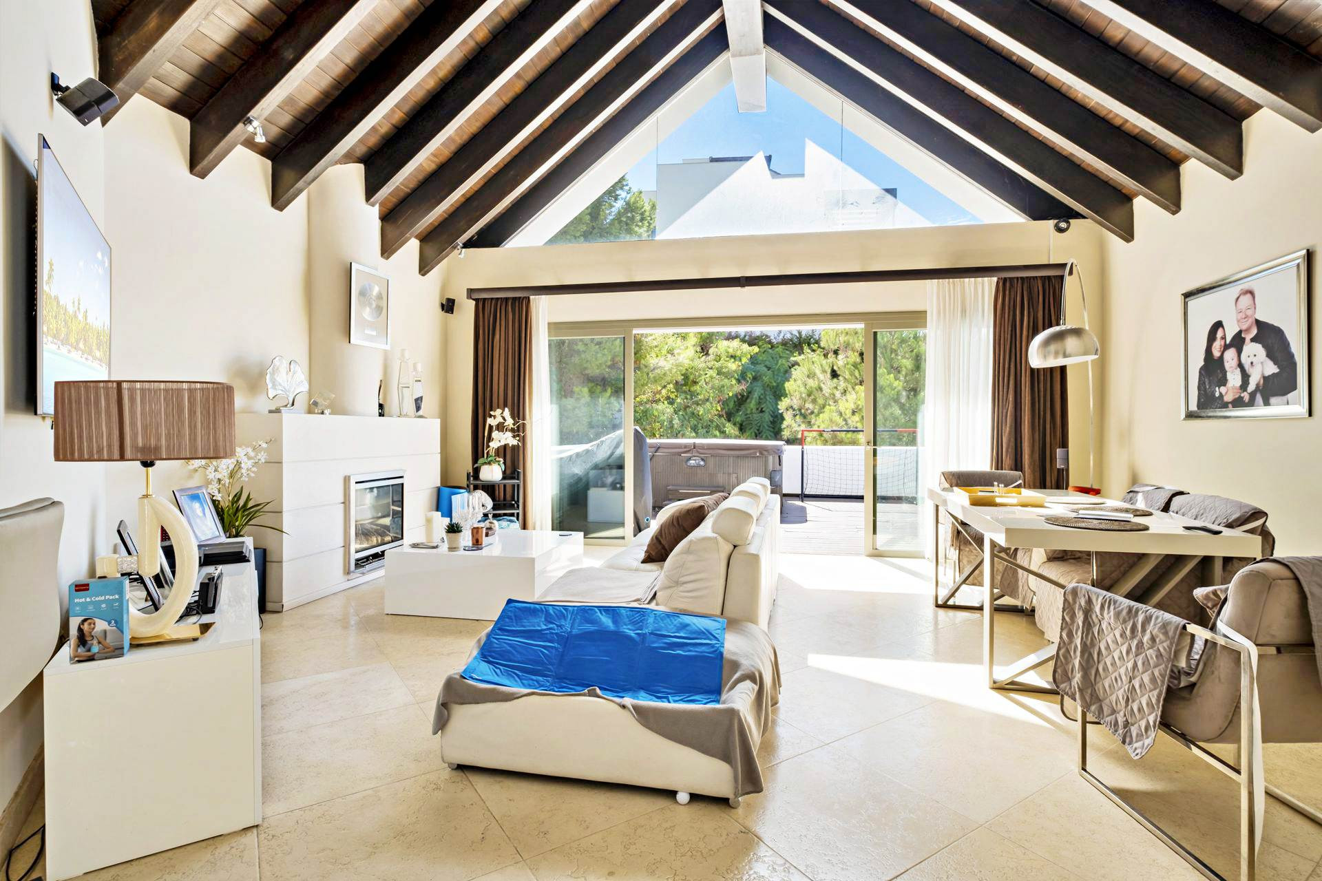 Huvudvåning: Living-dining rum med höga tak och en gas eldstad. Direkt tillgång till två terrasser, en med en jacuzzi.